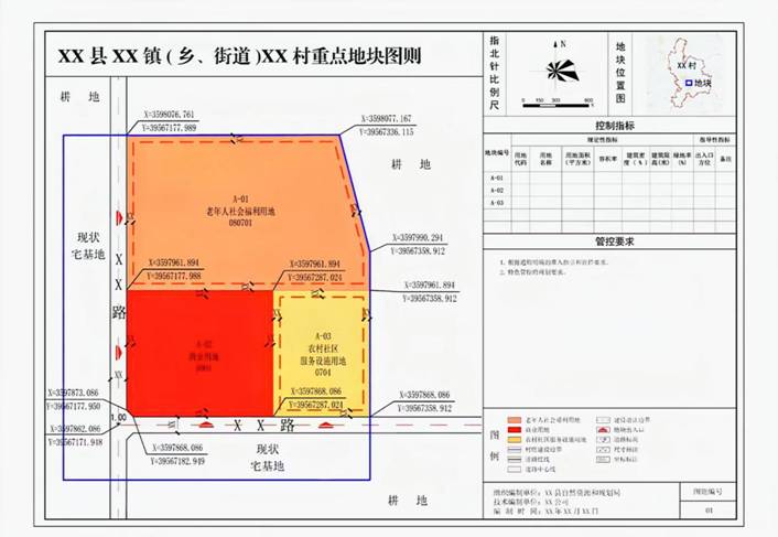 即重点地块图则(样图详见附件3)。拟实施除村民单独申请住房建设以外的其他乡村建设项目,应根据规划实施和许可管理需要,将项目单宗地或若干高度关联的多个宗地(区域)作为重点地块,编制重点地块图则,明确重点地块涉及宗地的用地位置、面积、土地用途、容积率、建筑密度、建筑高度等控制内容,作为对除村民建房以外其他乡村建设项目核发规划许可的重要依据。 |