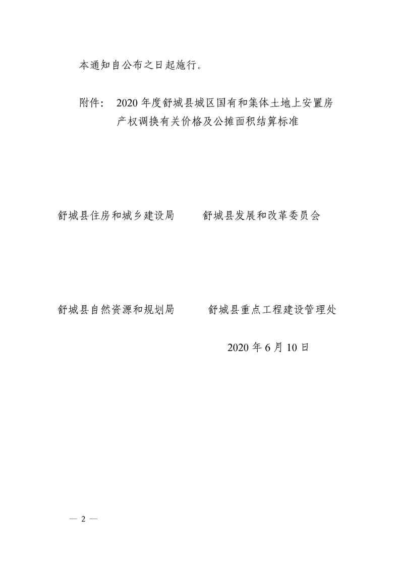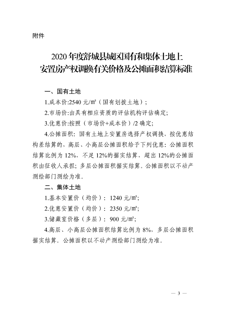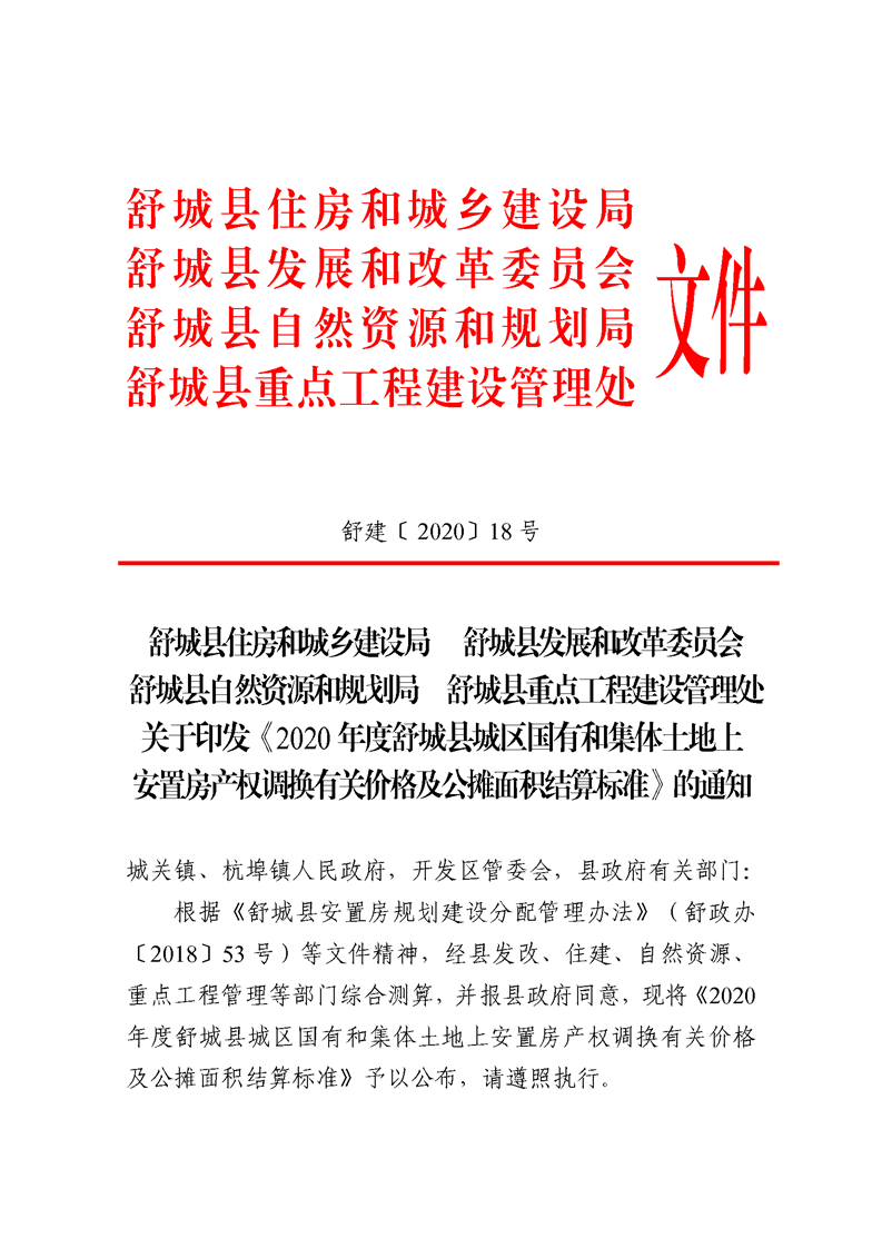 关于印发《2020年度舒城县城区国有和集体土地上安置房产权调换有关价格及公摊面积结算标准》的通知