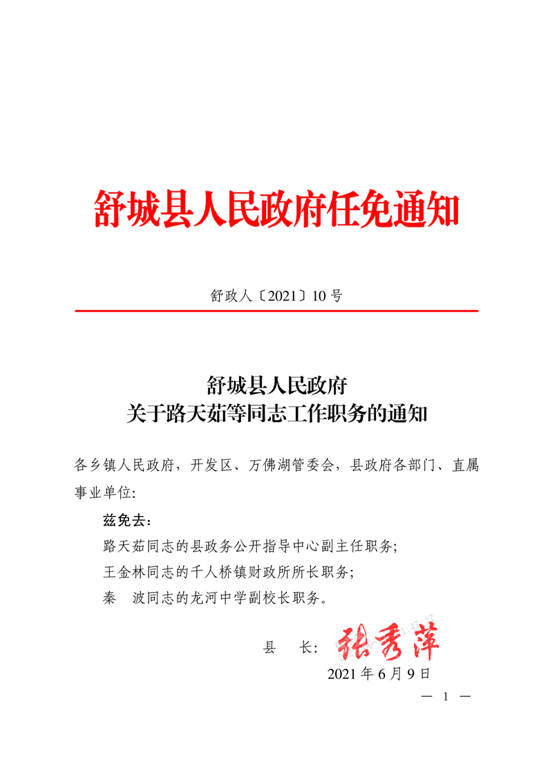 舒城县人民政府关于路天茹等同志工作职务的通知.pdf
