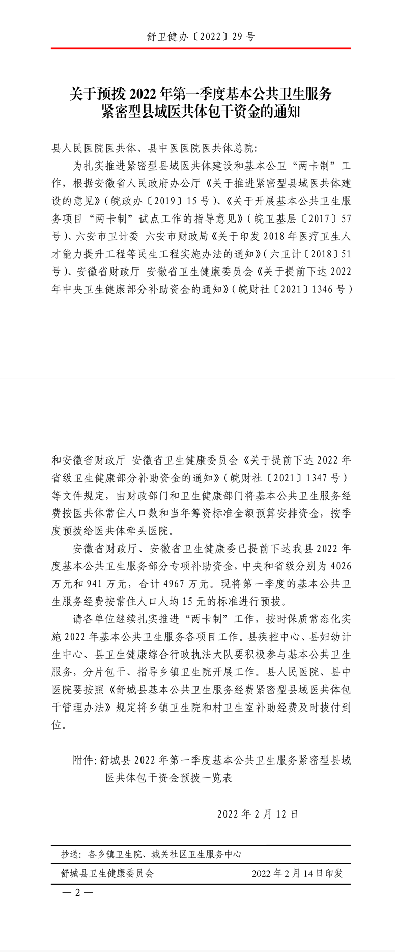 【舒城县卫健委】关于预拔2022年第一季度基本公共卫生服务紧密型县域医共体包干资金的通知