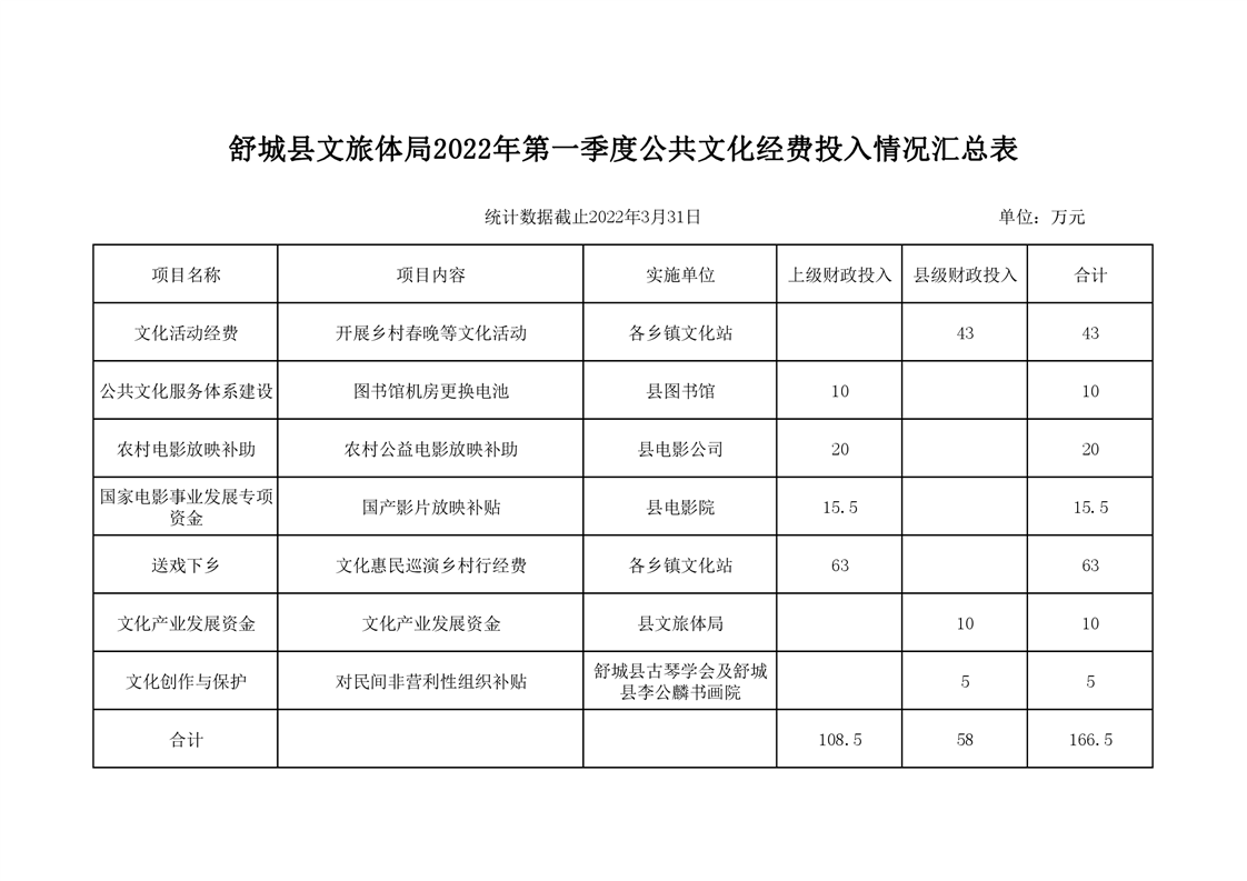 舒城县文化旅游体育局2022年第一季度公共文化经费投入情况汇总表