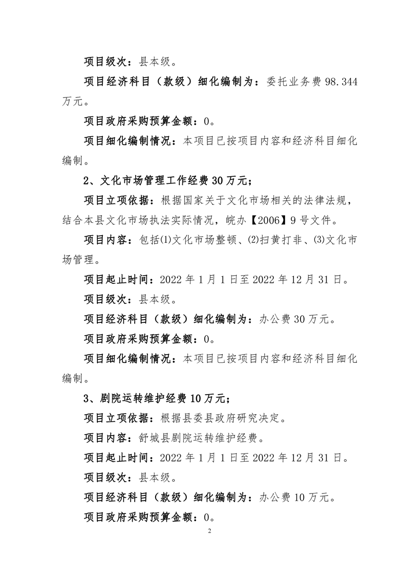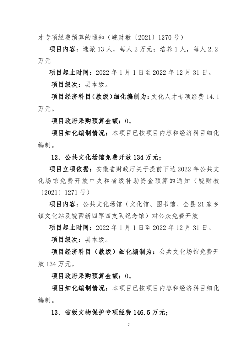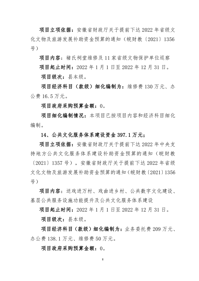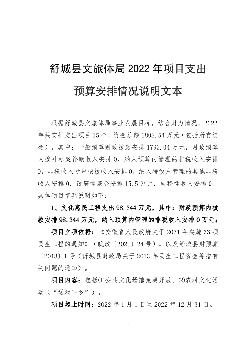 舒城县文化旅游体育局2022年部门项目支出预算安排情况文本