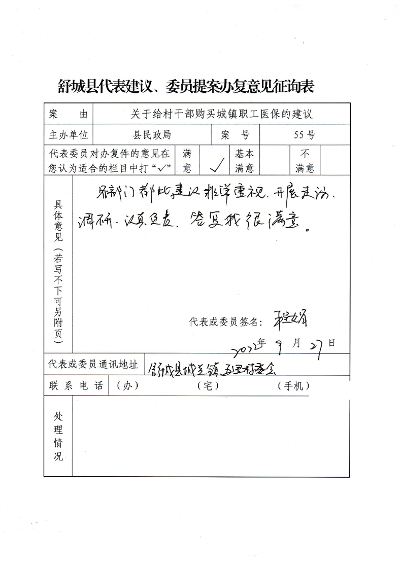 你们提出的《关于给村干部购买城镇职工医保的建议》收悉,现将办理情况答复如下: