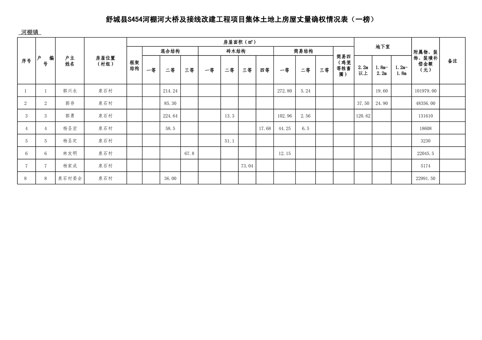 附 件:舒城县S454河棚河大桥及接线改建工程项目集体土地上房屋丈量确权情况表(一榜)