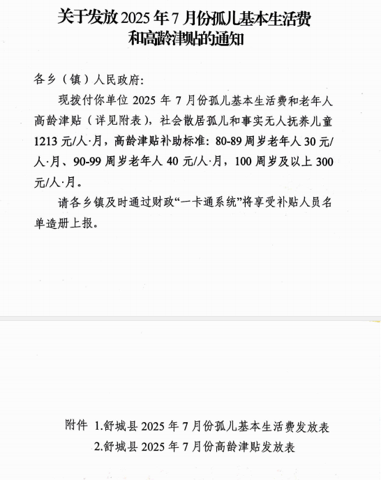 关于发放2025年7月份孤儿基本生活费和高龄津贴的通知