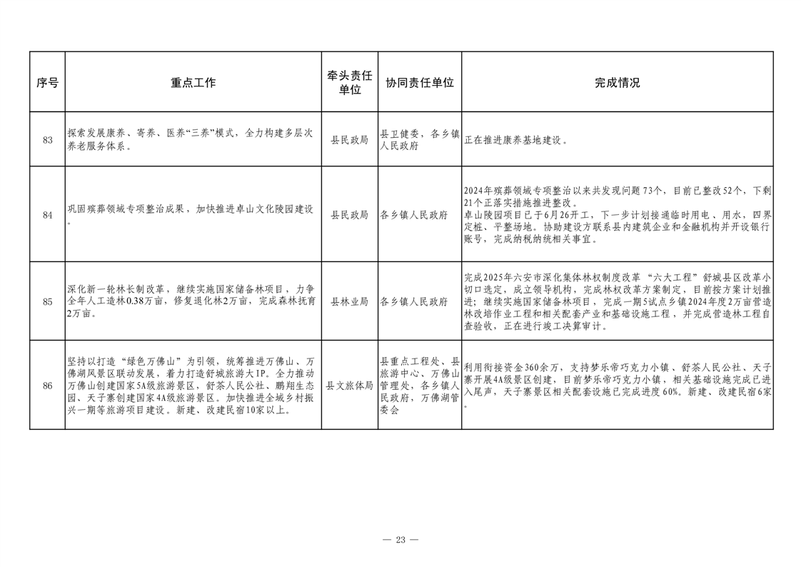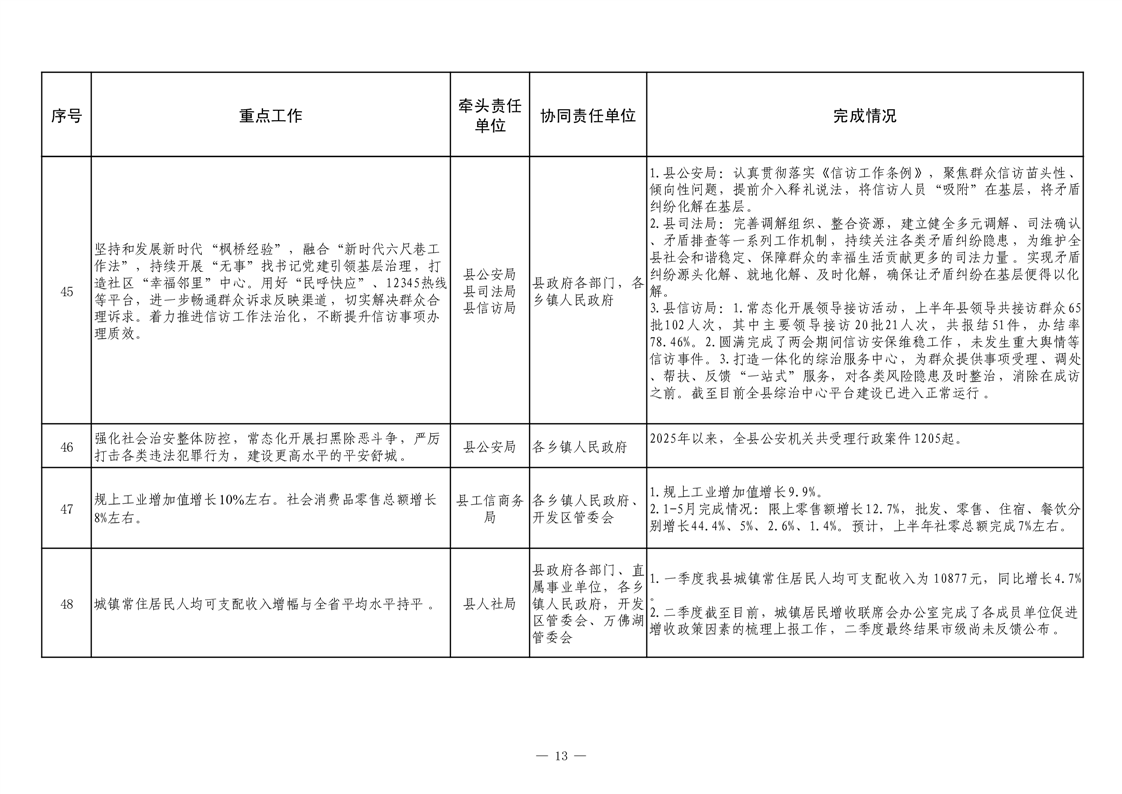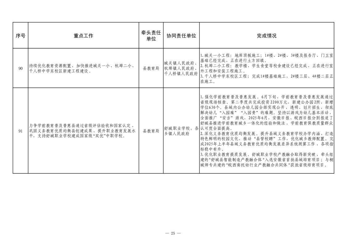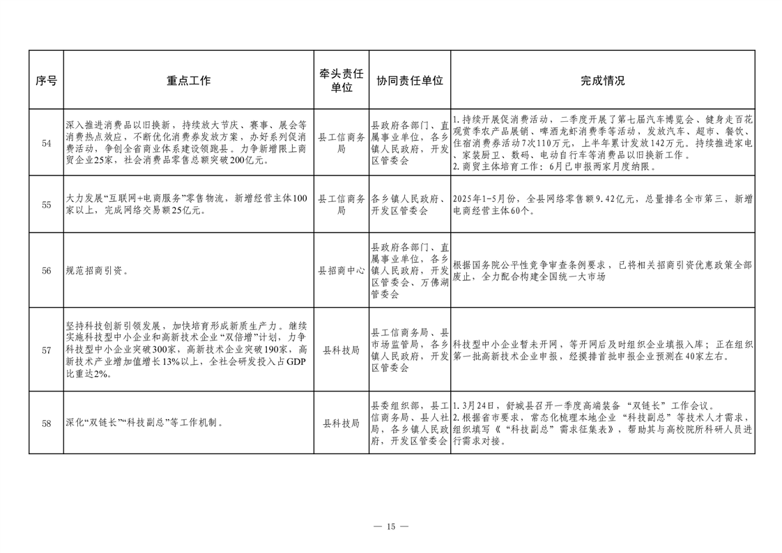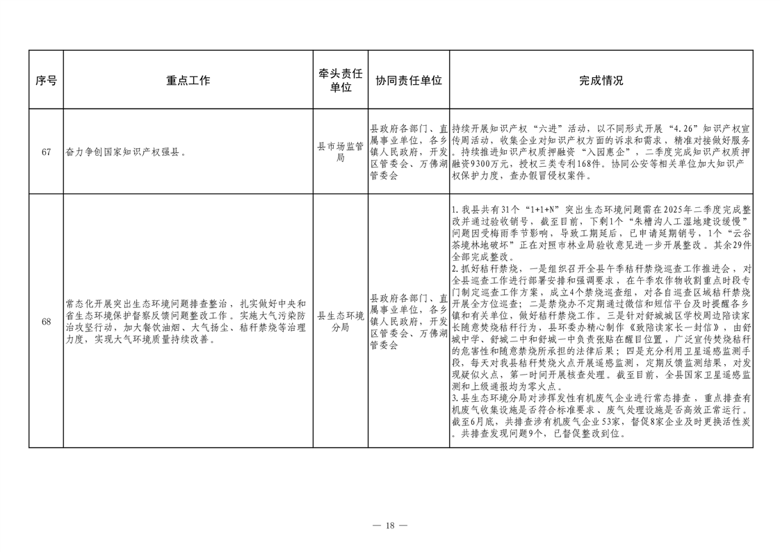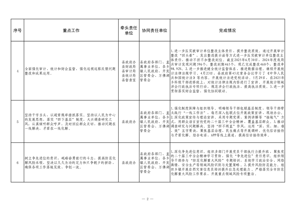 【重大决策部署贯彻落实情况】2025年县政府重点工作及责任清单二季度推进情况