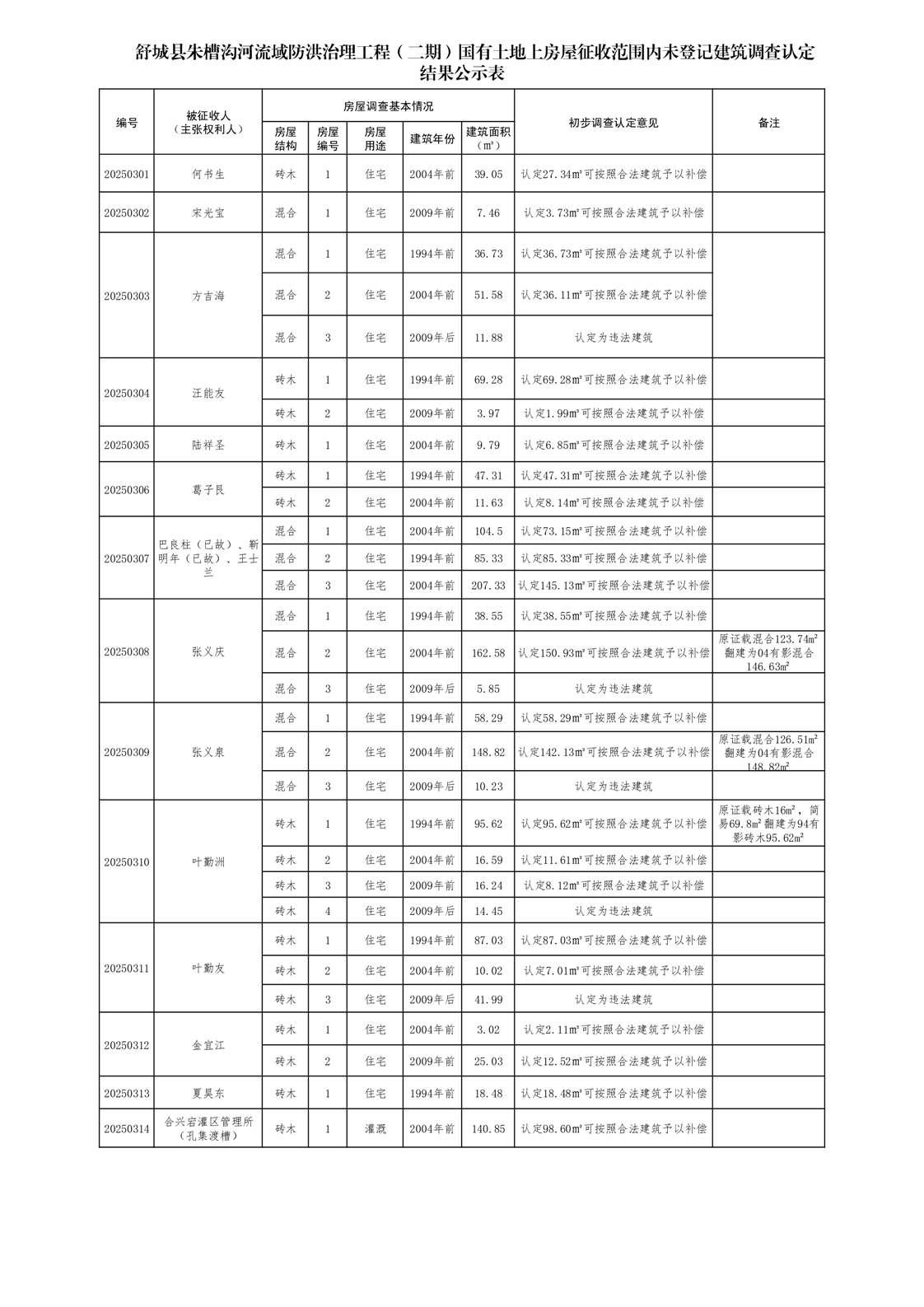 附 件:舒城县朱槽沟河流域防洪治理工程(二期)国有土地上房屋征收范围内未登记建筑调查认定结果公示表