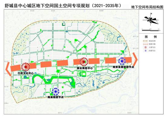 3、规划内容:规划以城市公共活动中心为发展源,以人行连通道为纽带,以城市重点功能区的综合开发或改造为布局重点,形成“一轴、两心、两点”的地下空间布局结构。通过地下空间资源的整合及综合利用,进一步从立体空间上合理有序地组织城市功能,提高城市土地的利用率,把舒城县建设成为环境优美、安全方便、功能齐全、自我防护能力强的现代化城市。