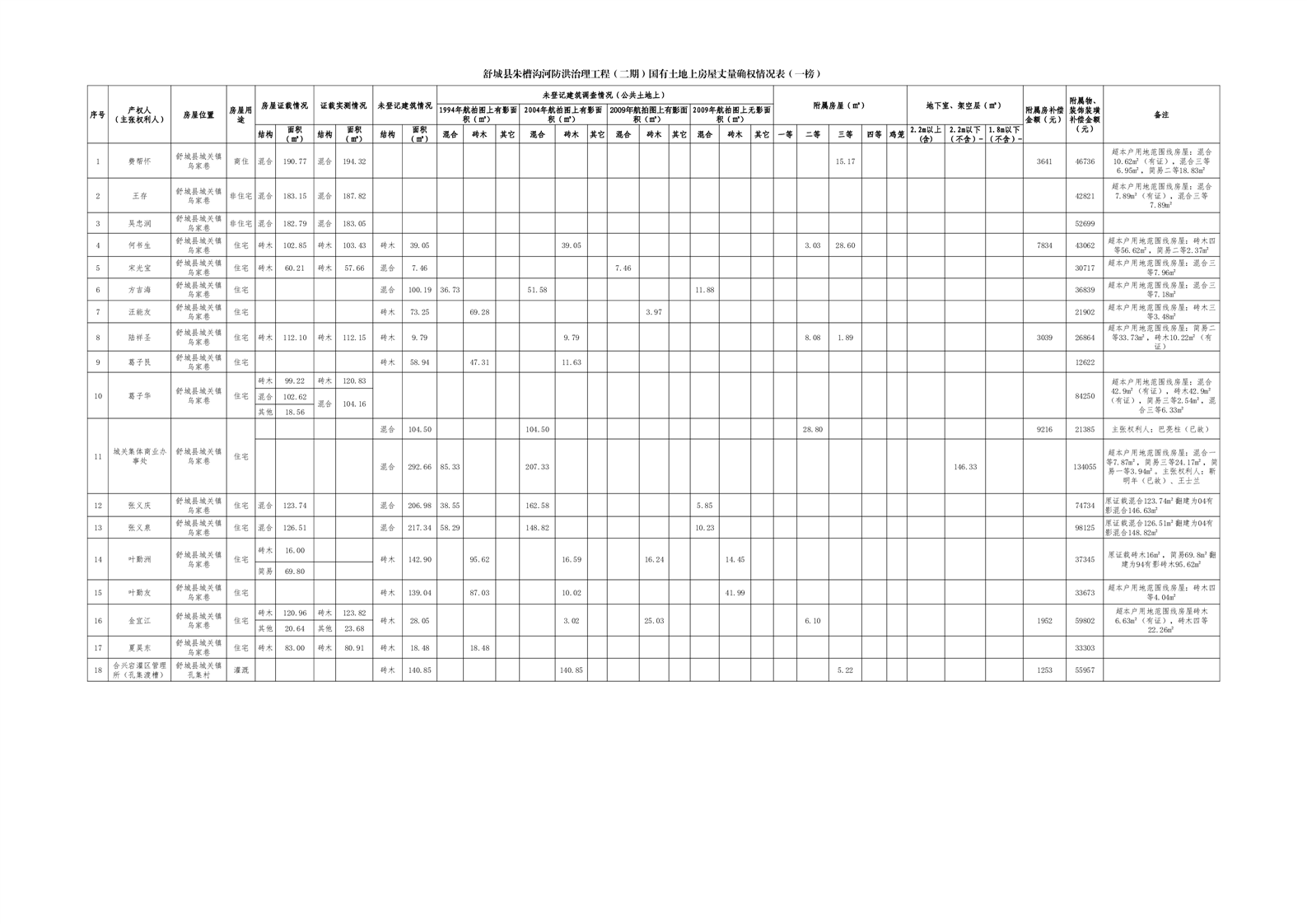 附 件: 舒城县朱槽沟河防洪治理工程(二期)国有土地上房屋丈量确权情况表(一榜)