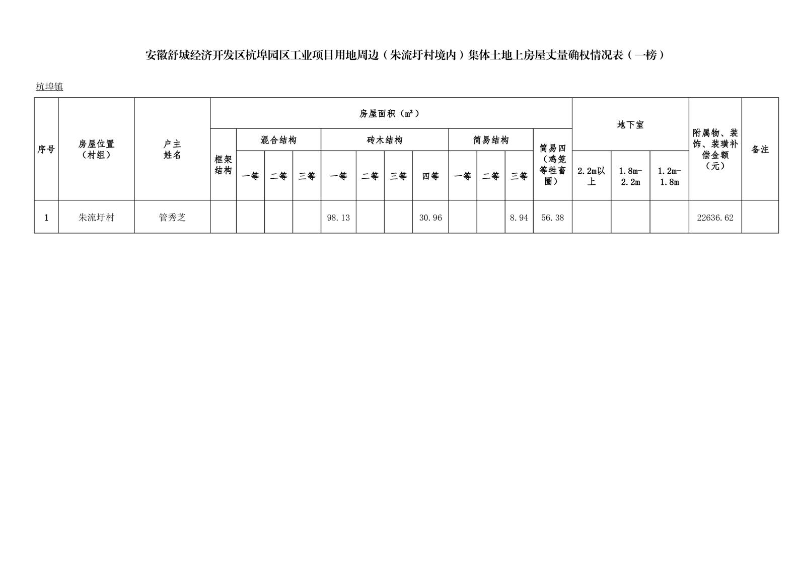 附 件:安徽舒城经济开发区杭埠园区工业项目用地周边(朱流圩村境内)集体土地上房屋丈量确权情况表(一榜)