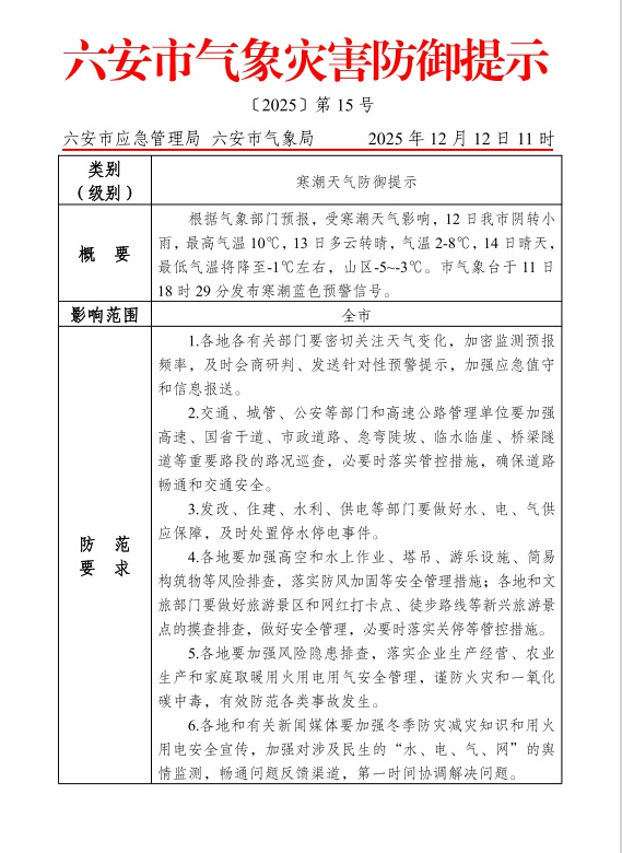 【气象灾害预警】六安市气象灾害预警信息