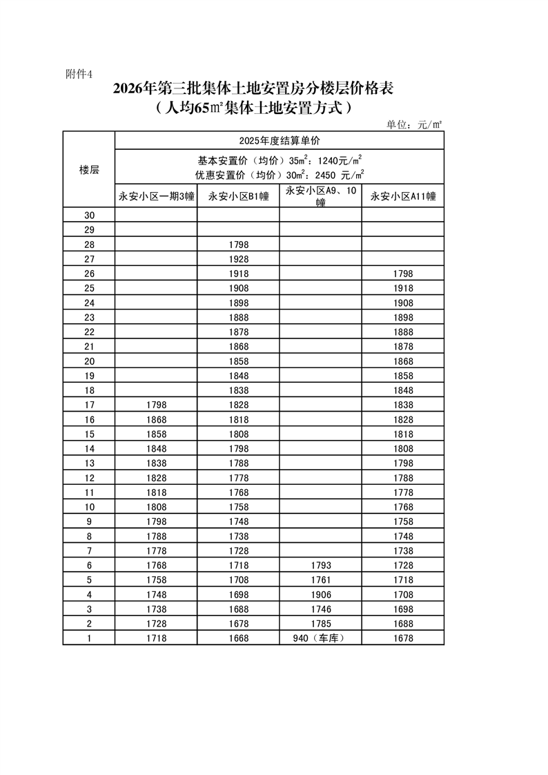 4.2026年第三批集体土地安置房分配住宅分楼层价格表(人均65平方集体土地安置方式)