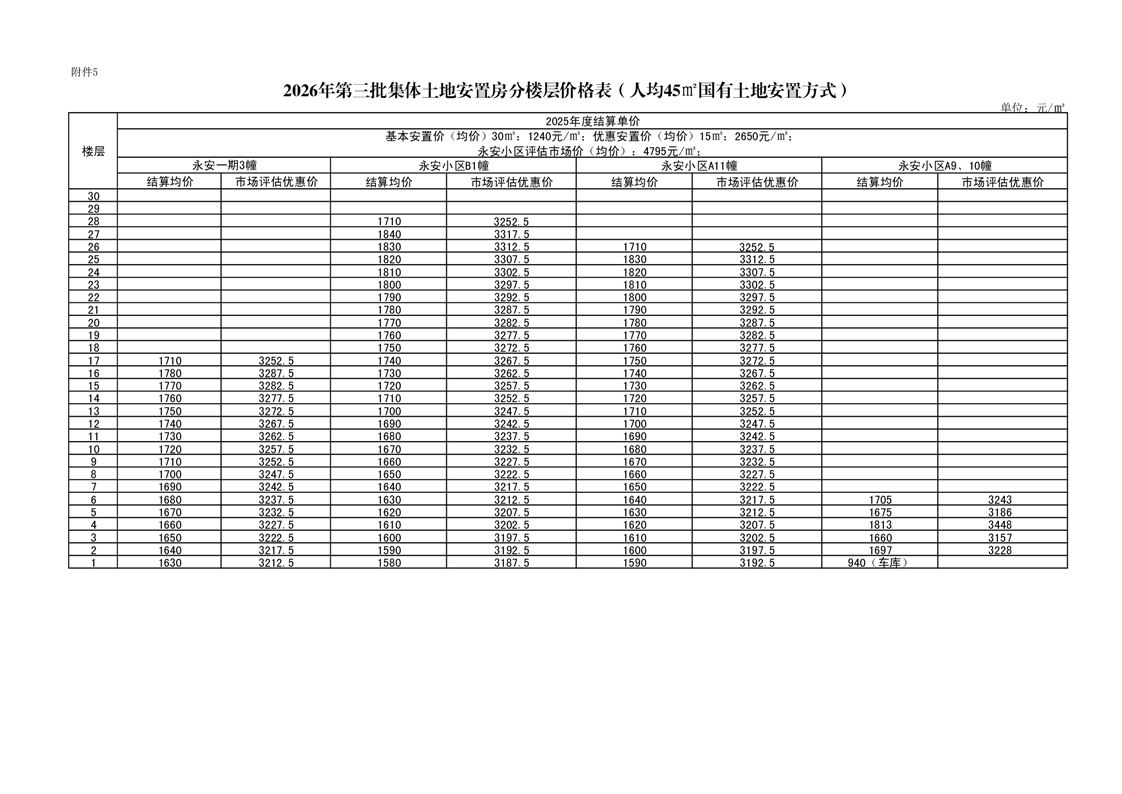 5.2026年第三批集体土地安置房分配住宅分楼层价格表(人均45平方国有土地安置方式)