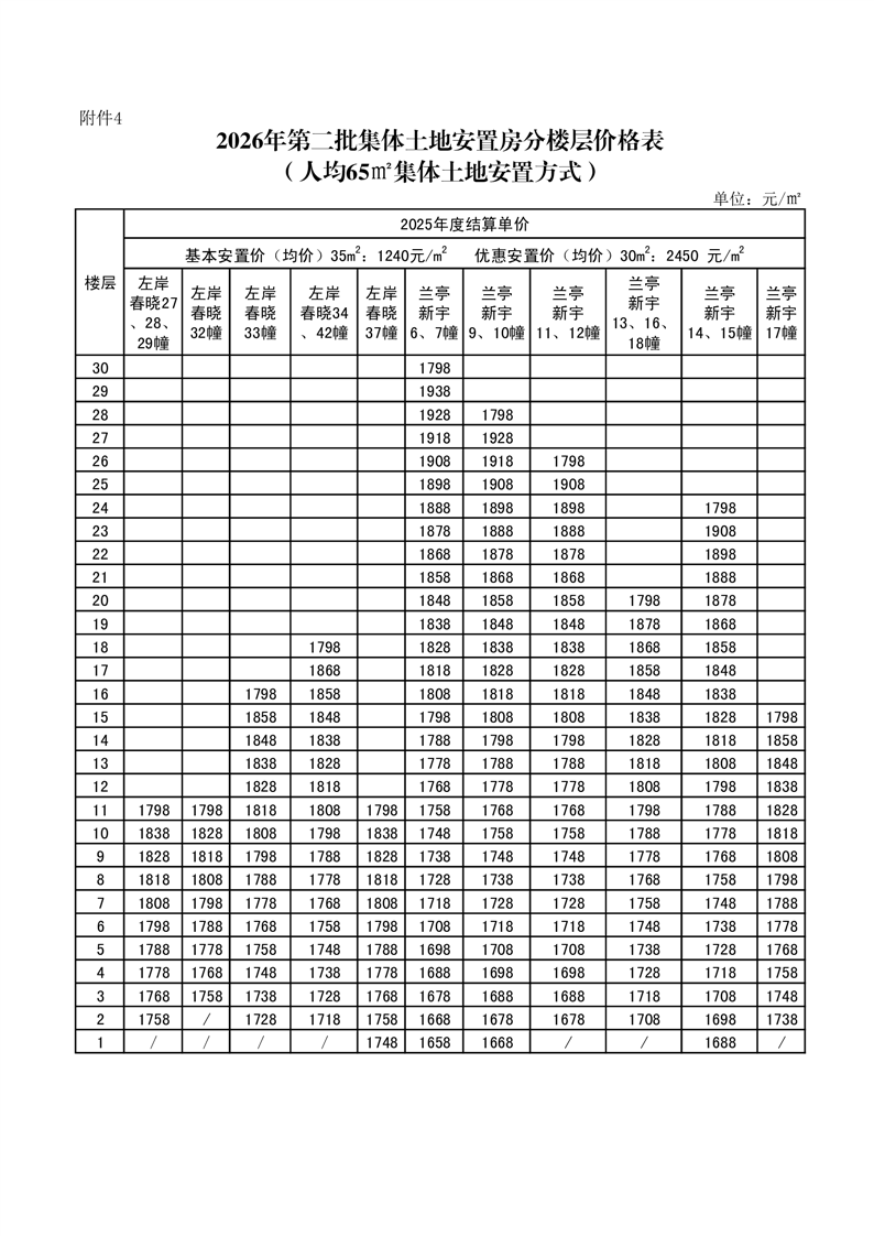 4.2026年第二批集体土地安置房分配住宅分楼层价格表(人均65平方集体土地安置方式)
