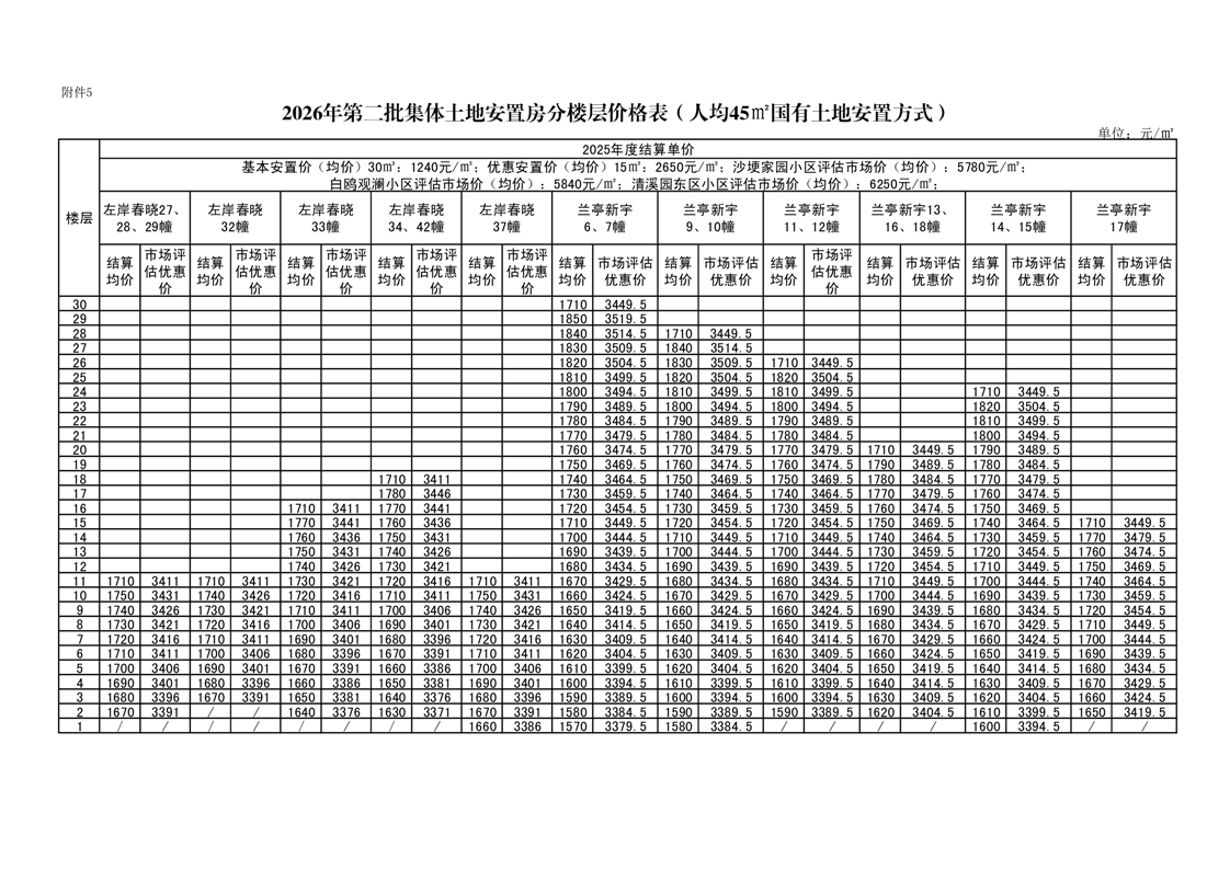 5.2026年第二批集体土地安置房分配住宅分楼层价格表(人均45平方国有土地安置方式)