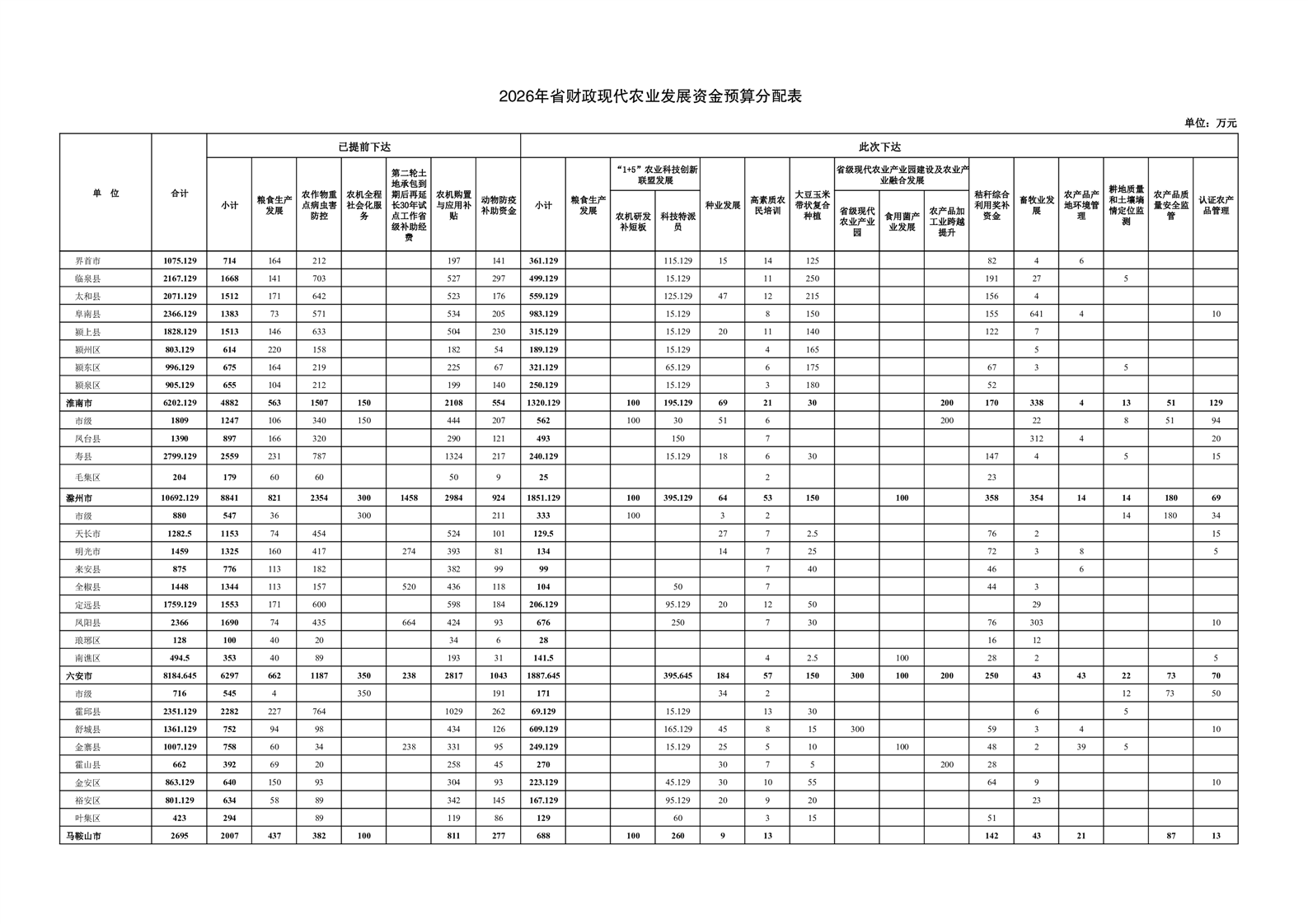为支持各地做好现代农业发展工作,现将2026年省财政现代农业发展资金预算下达你单位(具体金额详见附件1),收入列2026年政府收支分类科目“1100252农林水共同财政事权转移支付收入”,支出列“213农林水支出”,项目代码:340000251415000000010。2026年现代农业发展资金绩效目标(详见附件2、3)一并下达,请按照《安徽省现代农业发展资金管理办法》(皖财农〔2025〕310号)等有关规定,加强资金使用管理和绩效监控,提高资金使用效益。