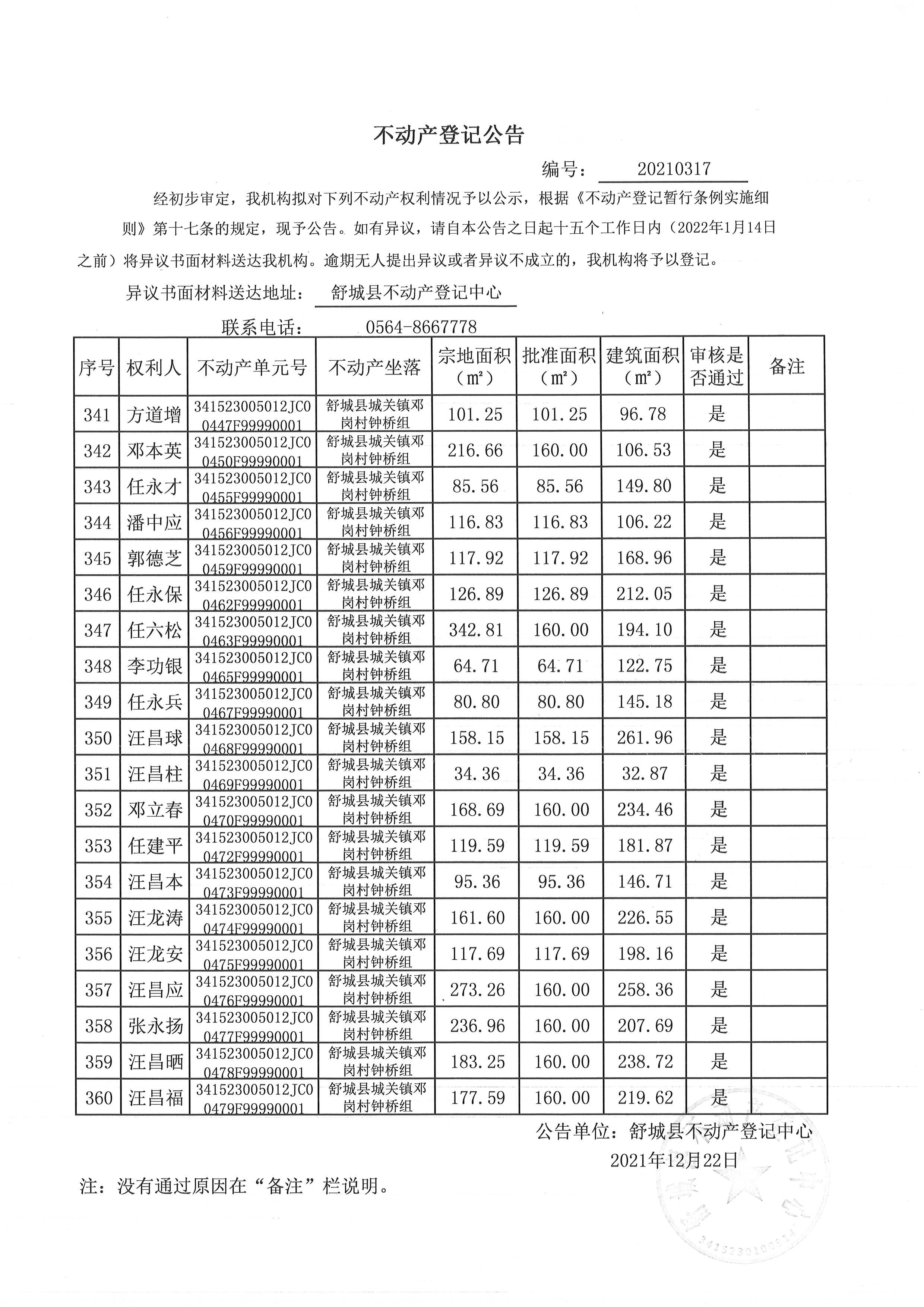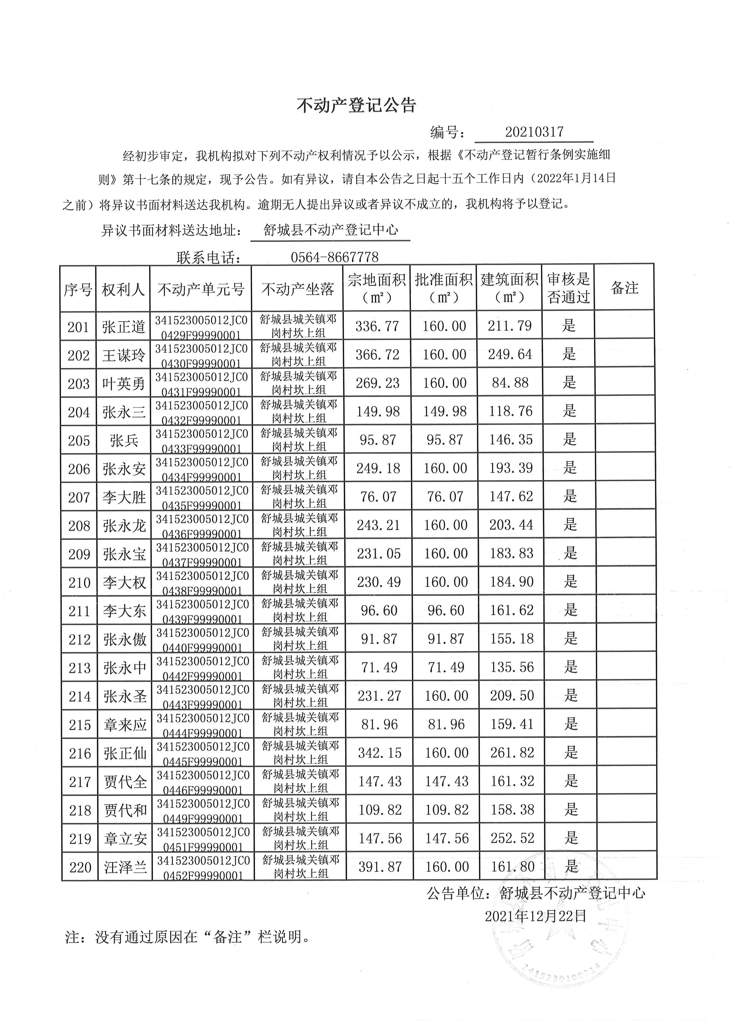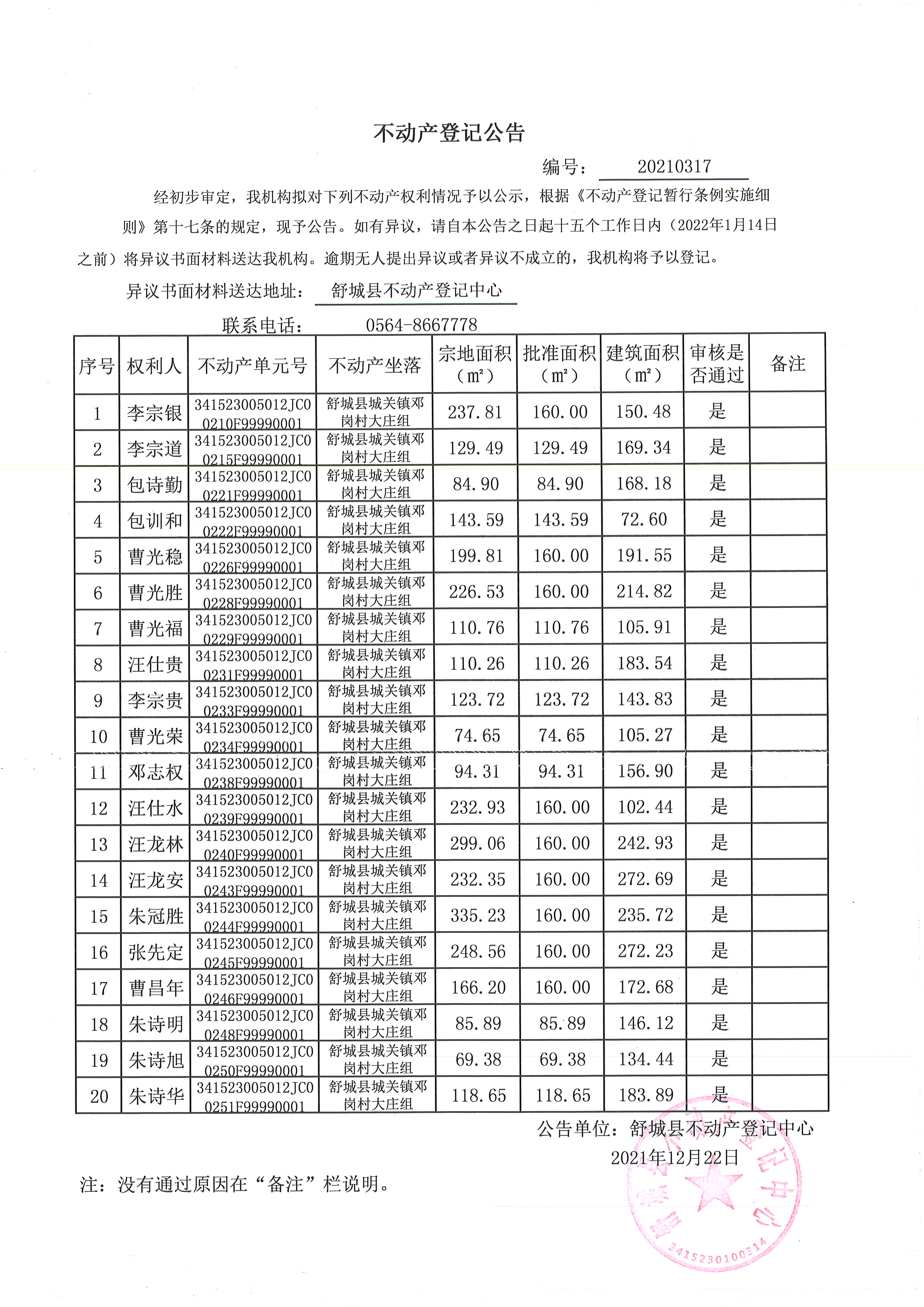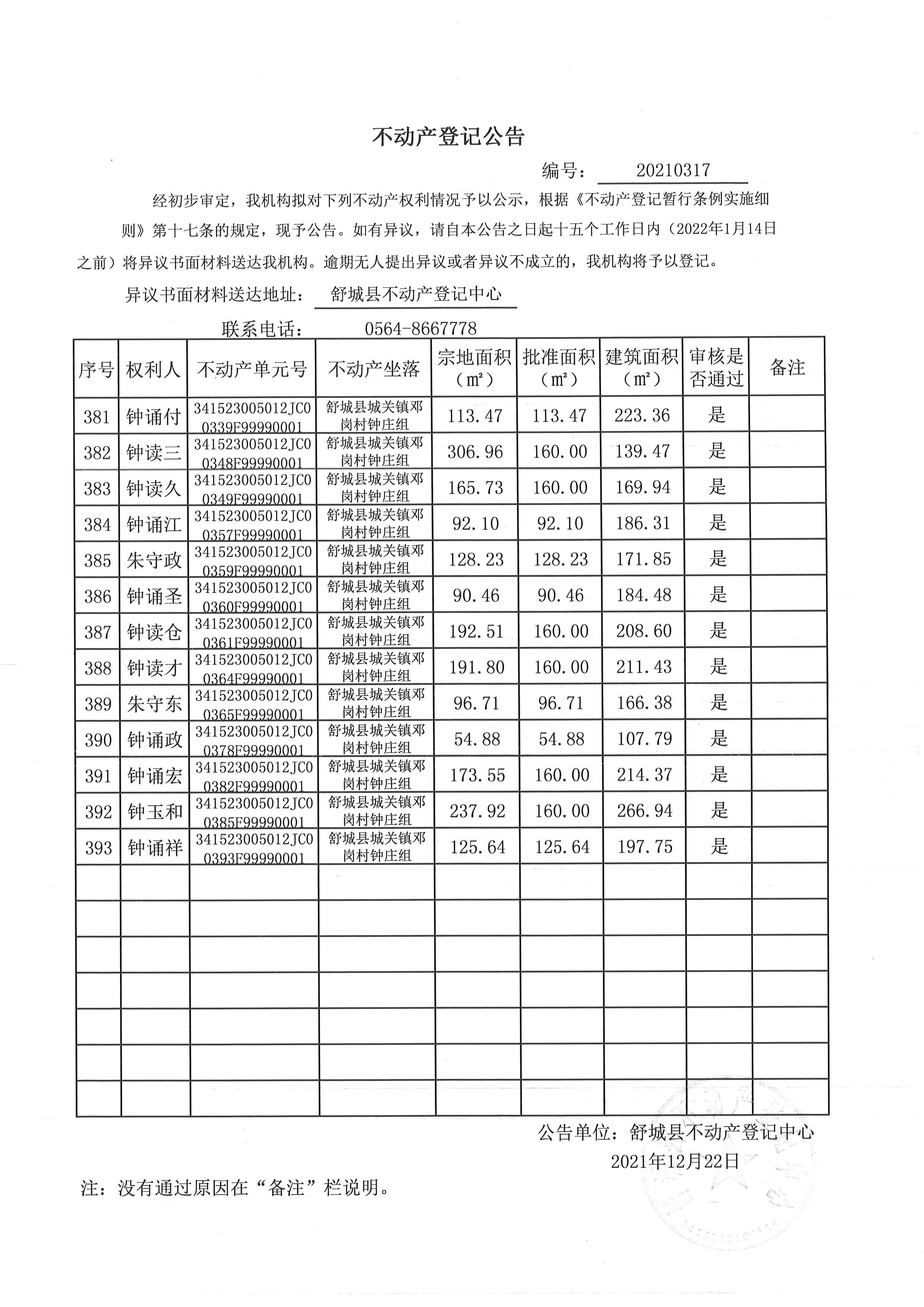 关于舒城县城关镇邓岗村大庄组等16个村民组农村不动产权利首次登记公告