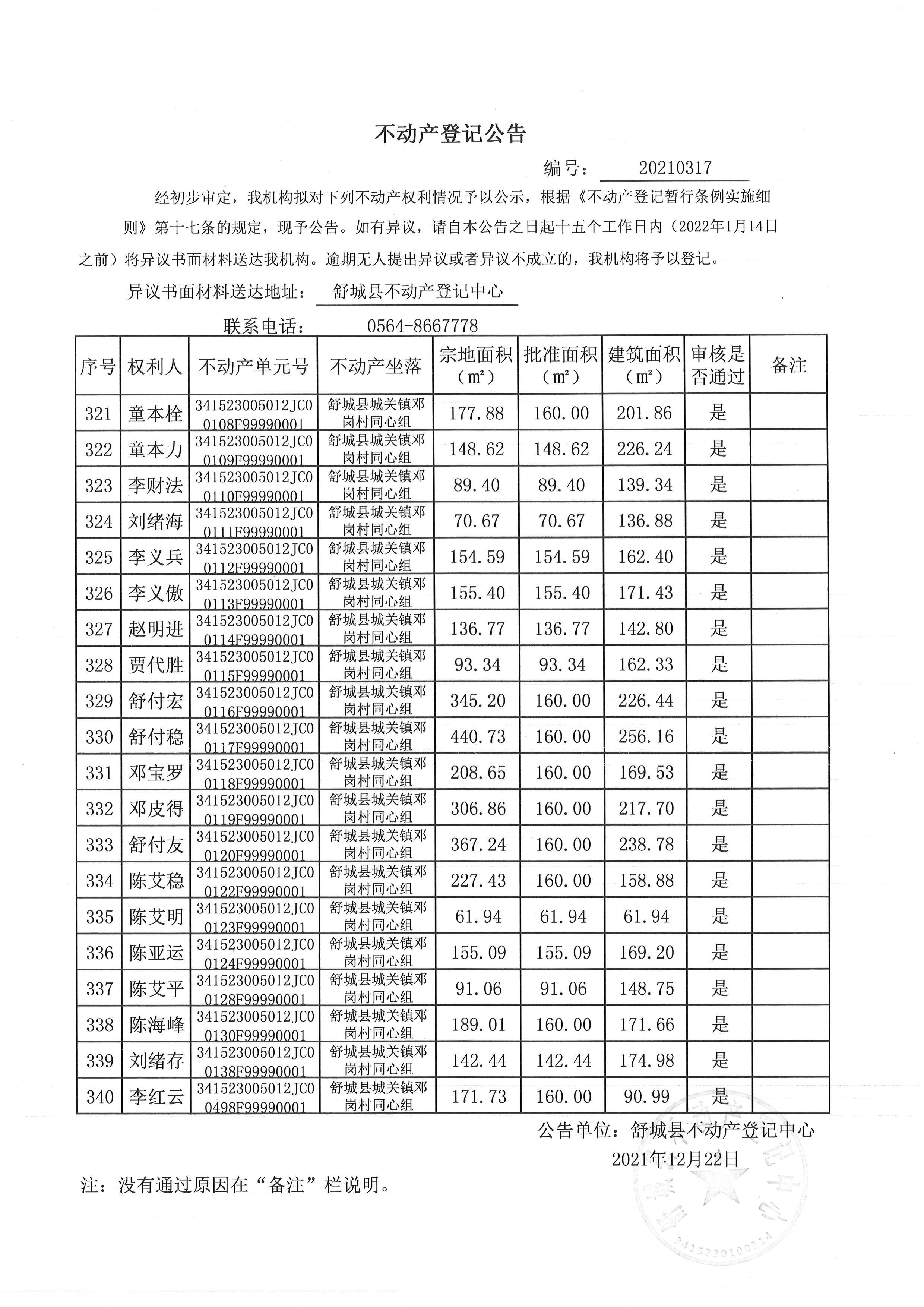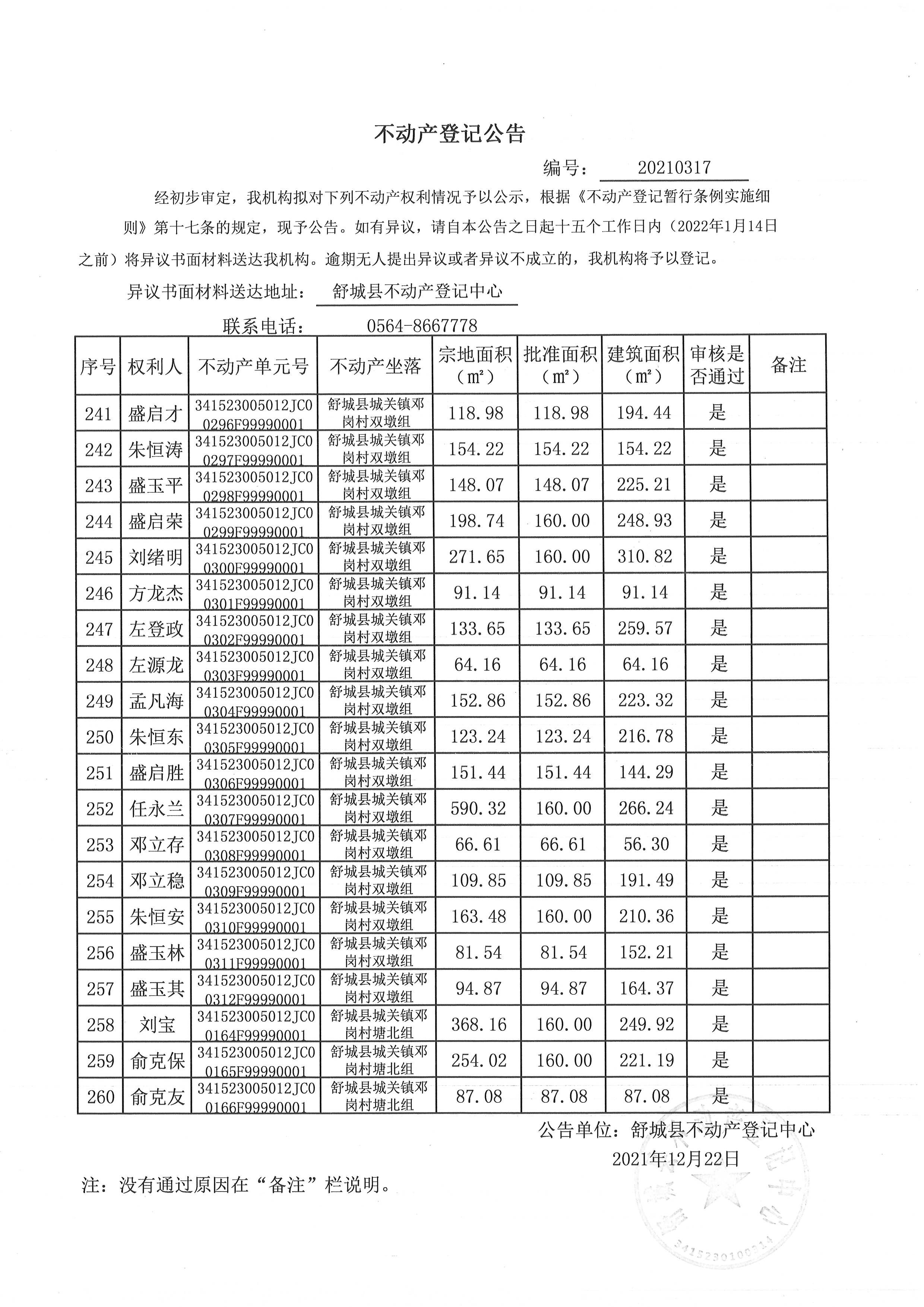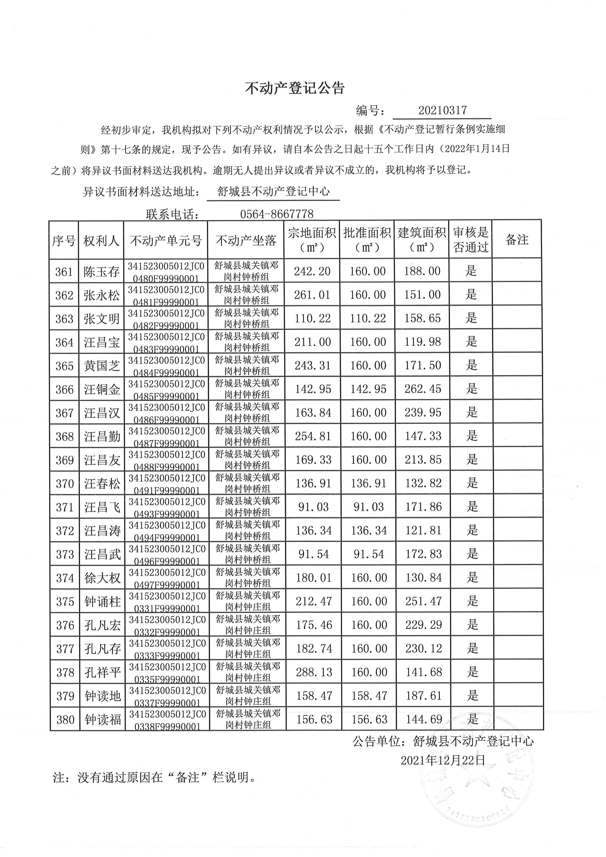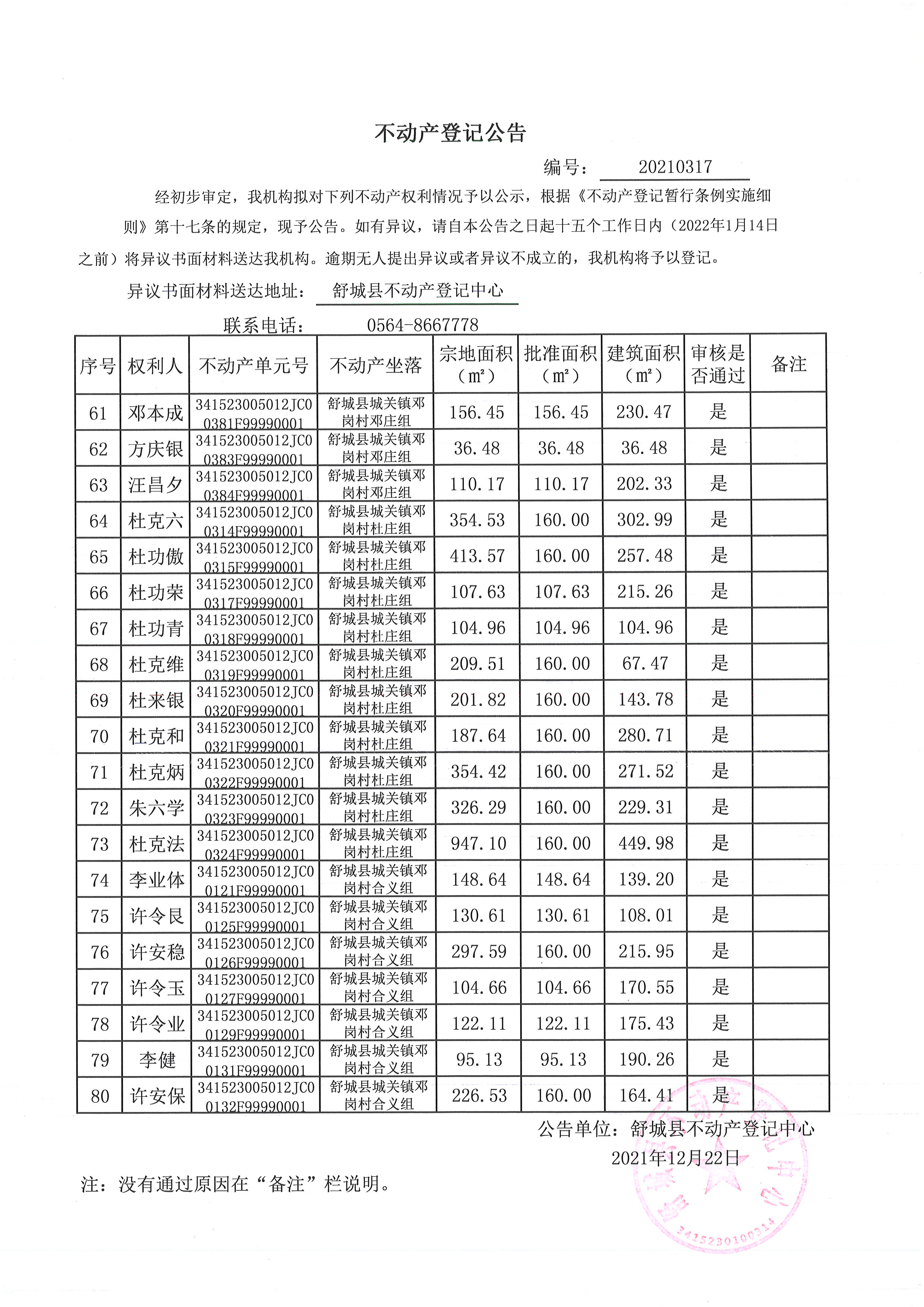关于舒城县城关镇邓岗村大庄组等16个村民组农村不动产权利首次登记公告
