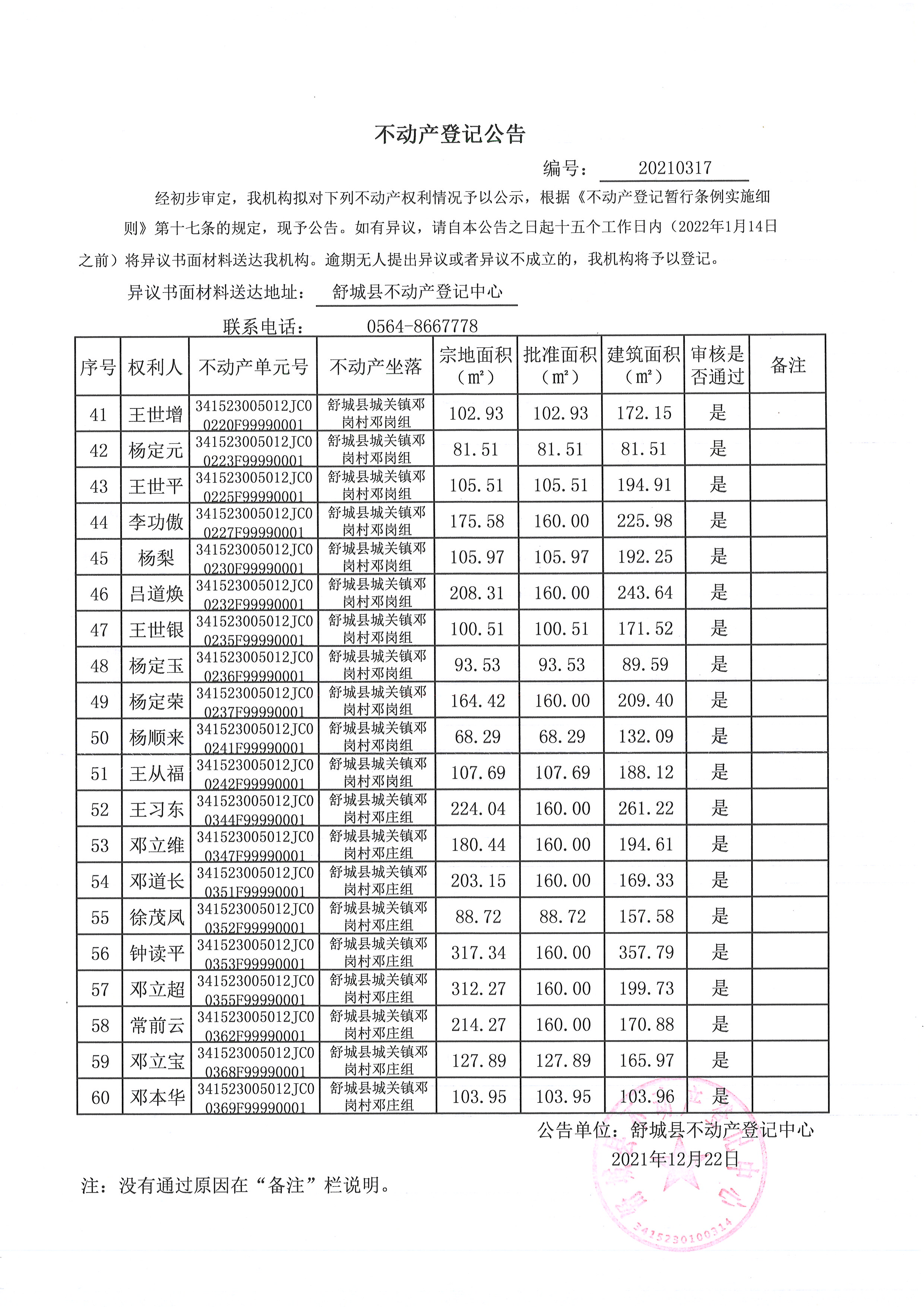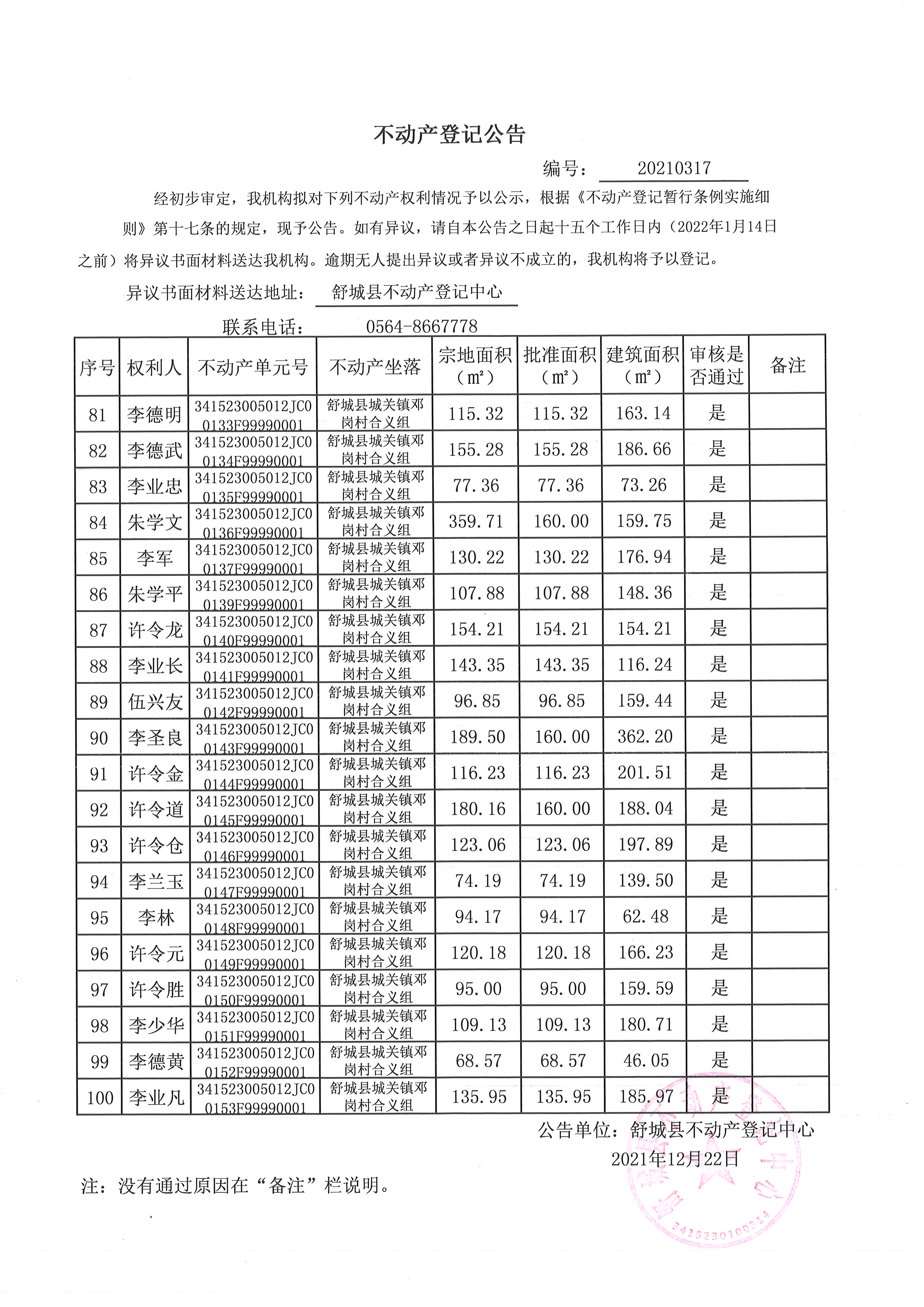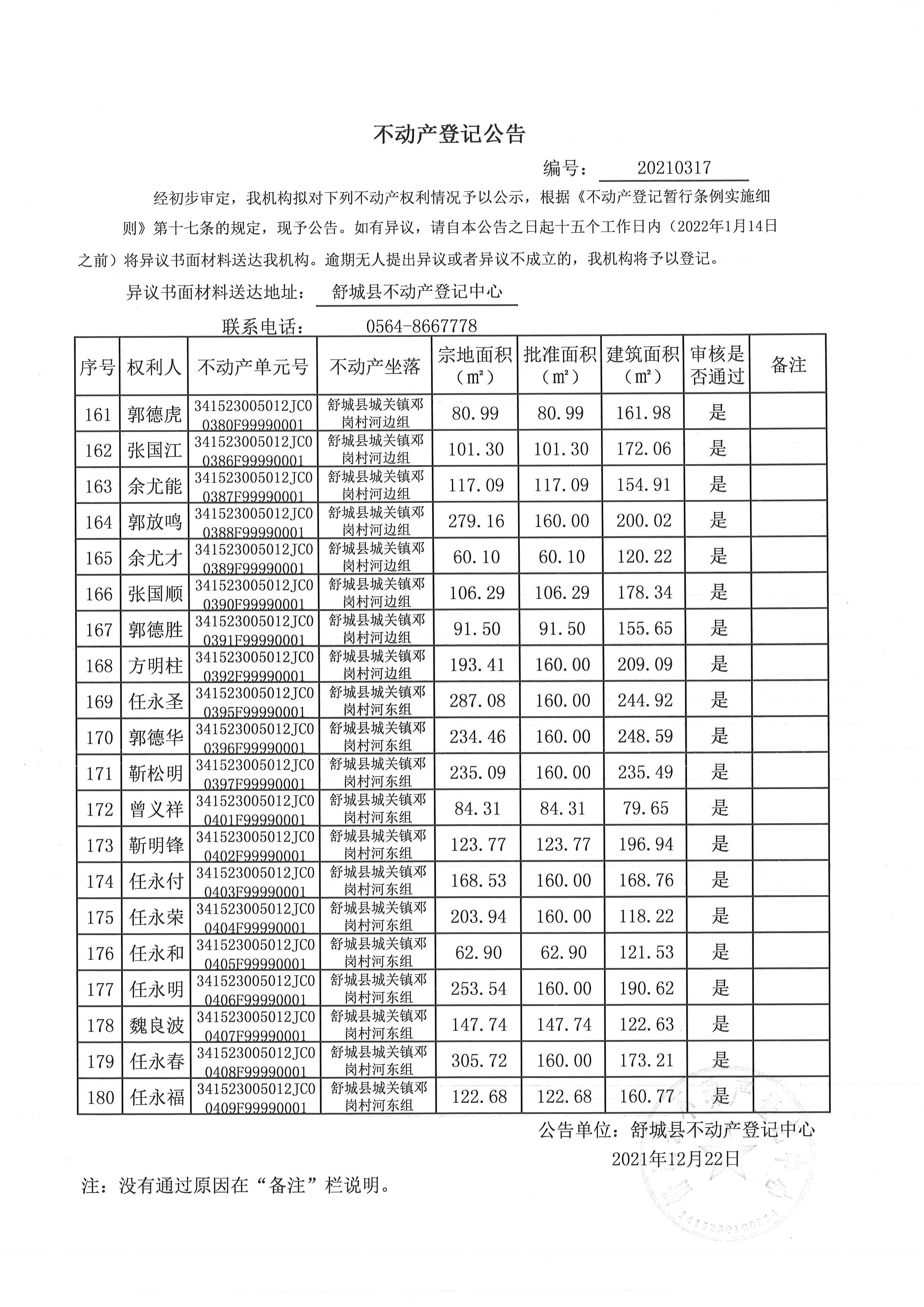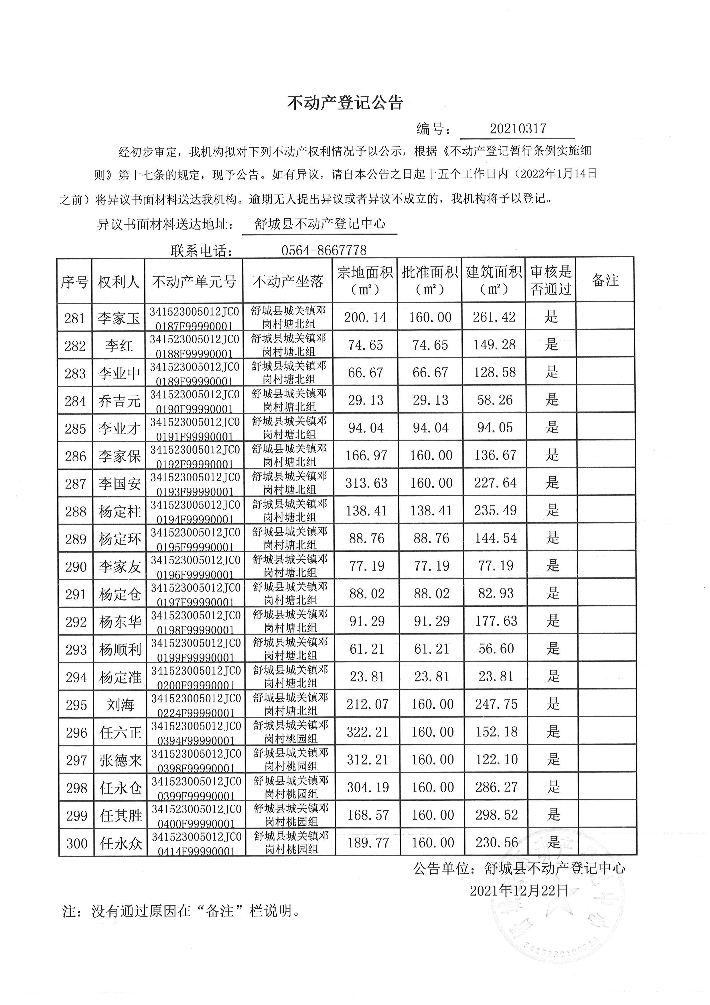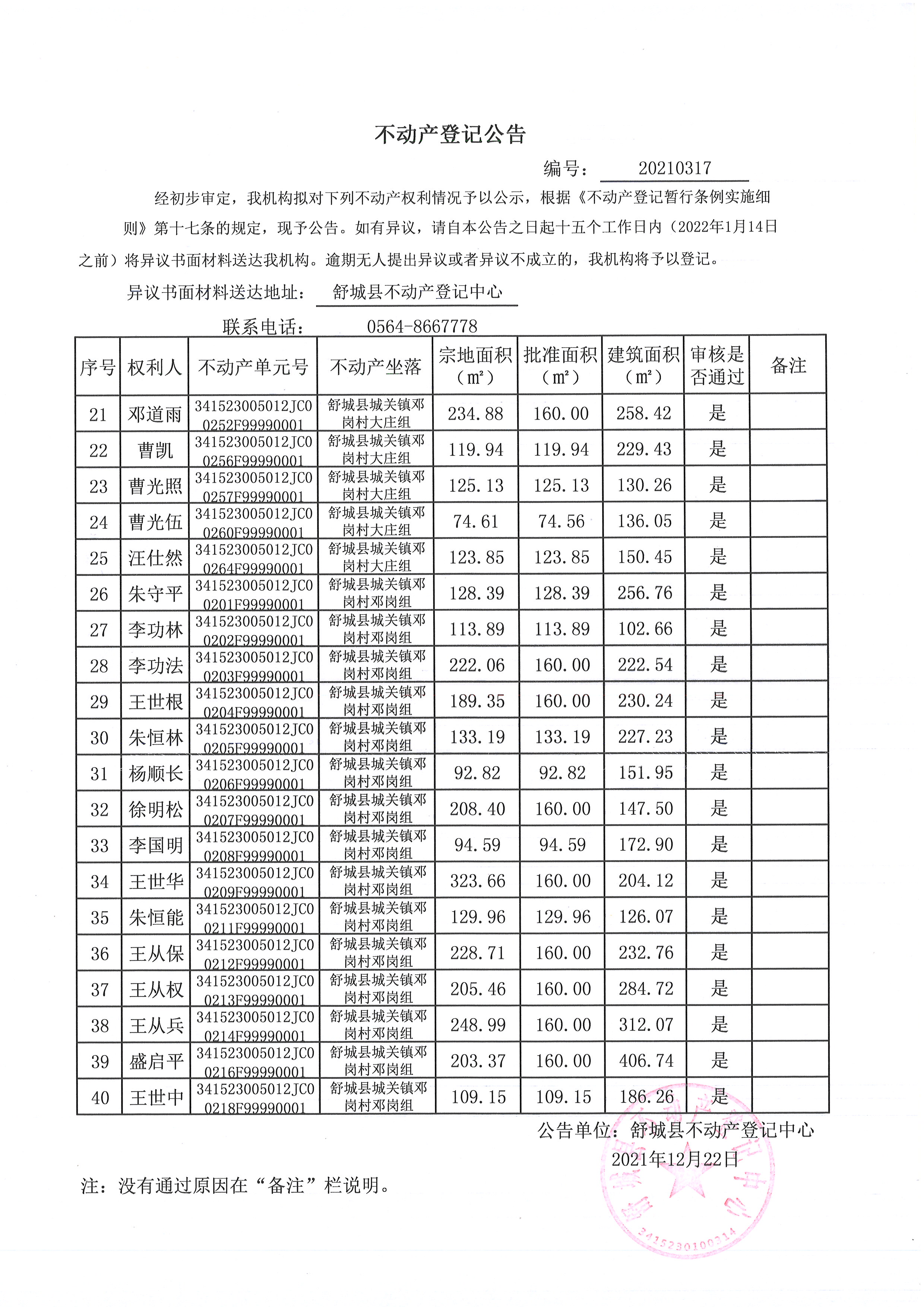 关于舒城县城关镇邓岗村大庄组等16个村民组农村不动产权利首次登记公告