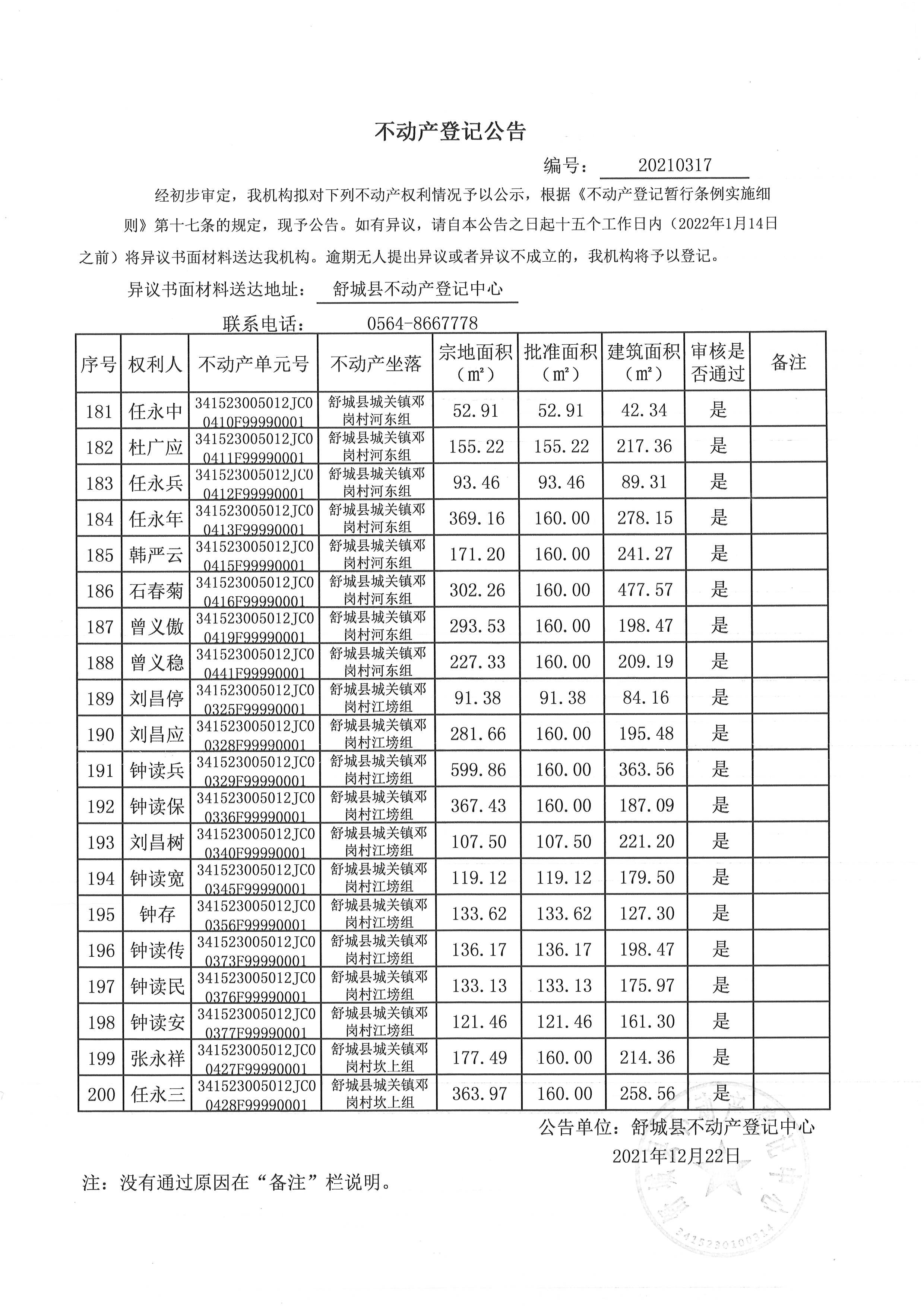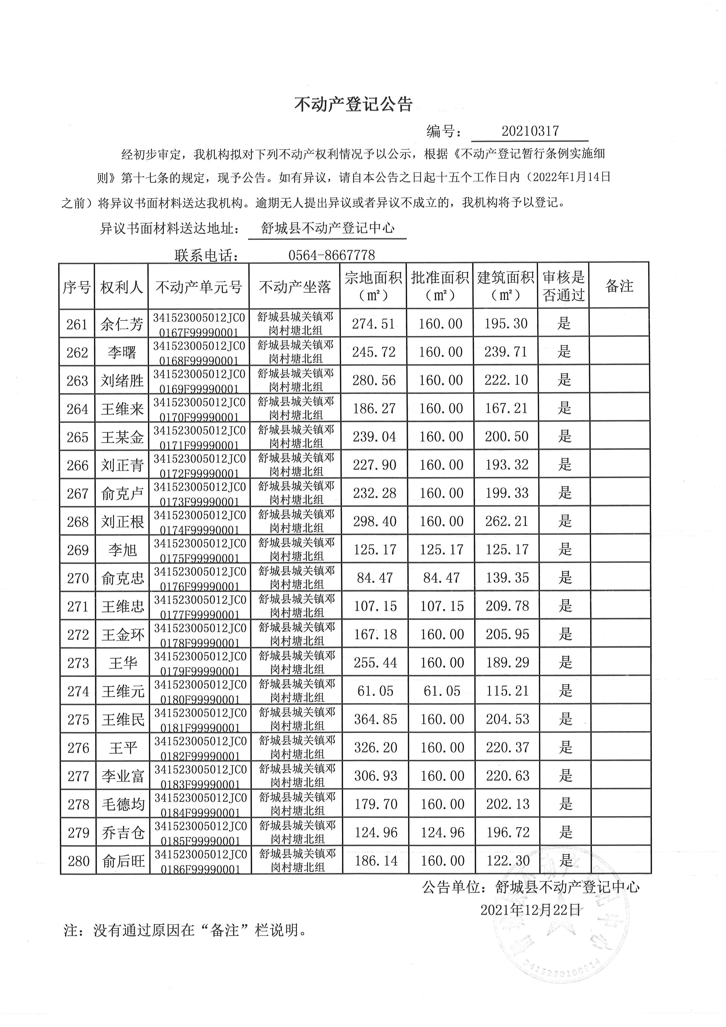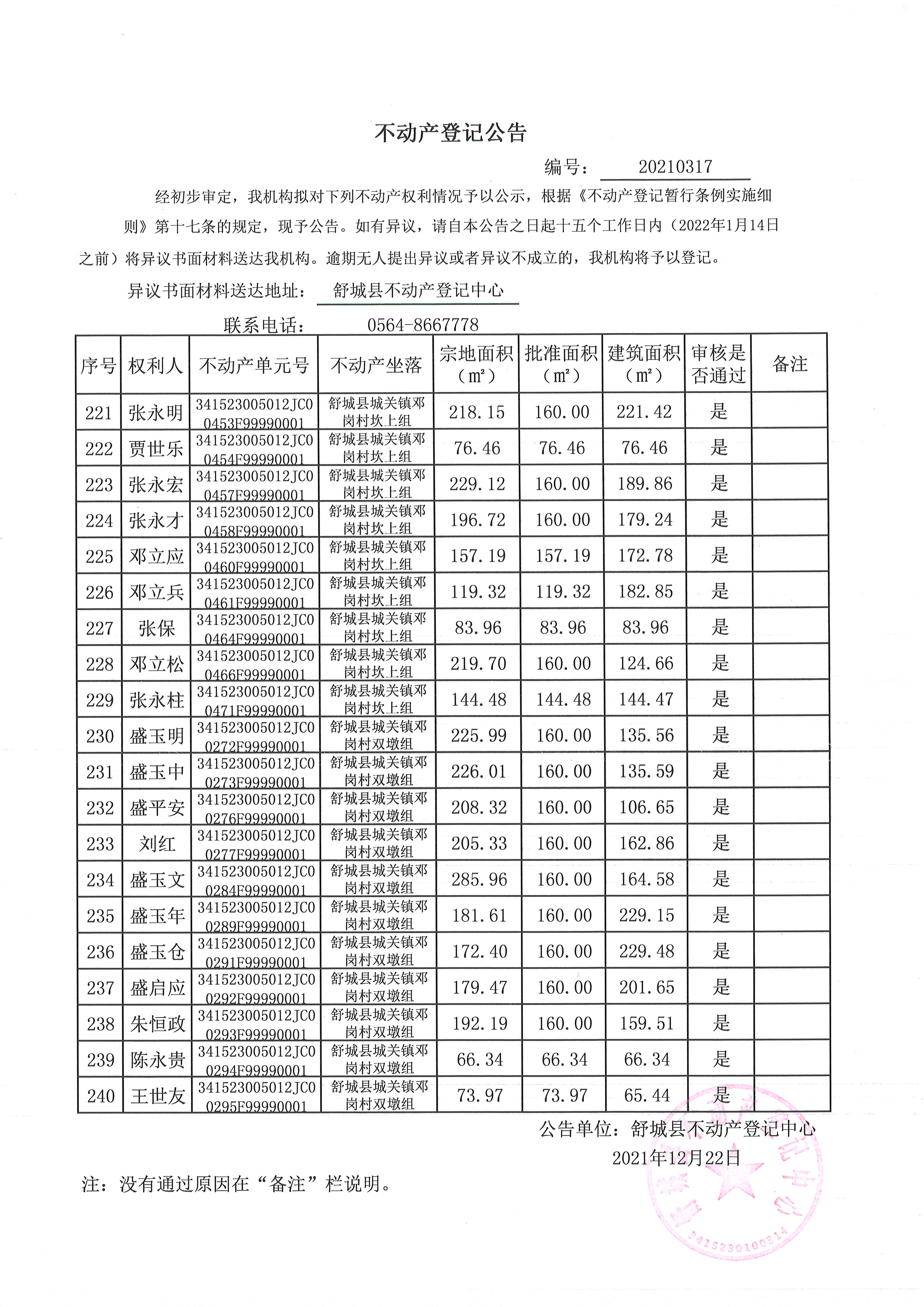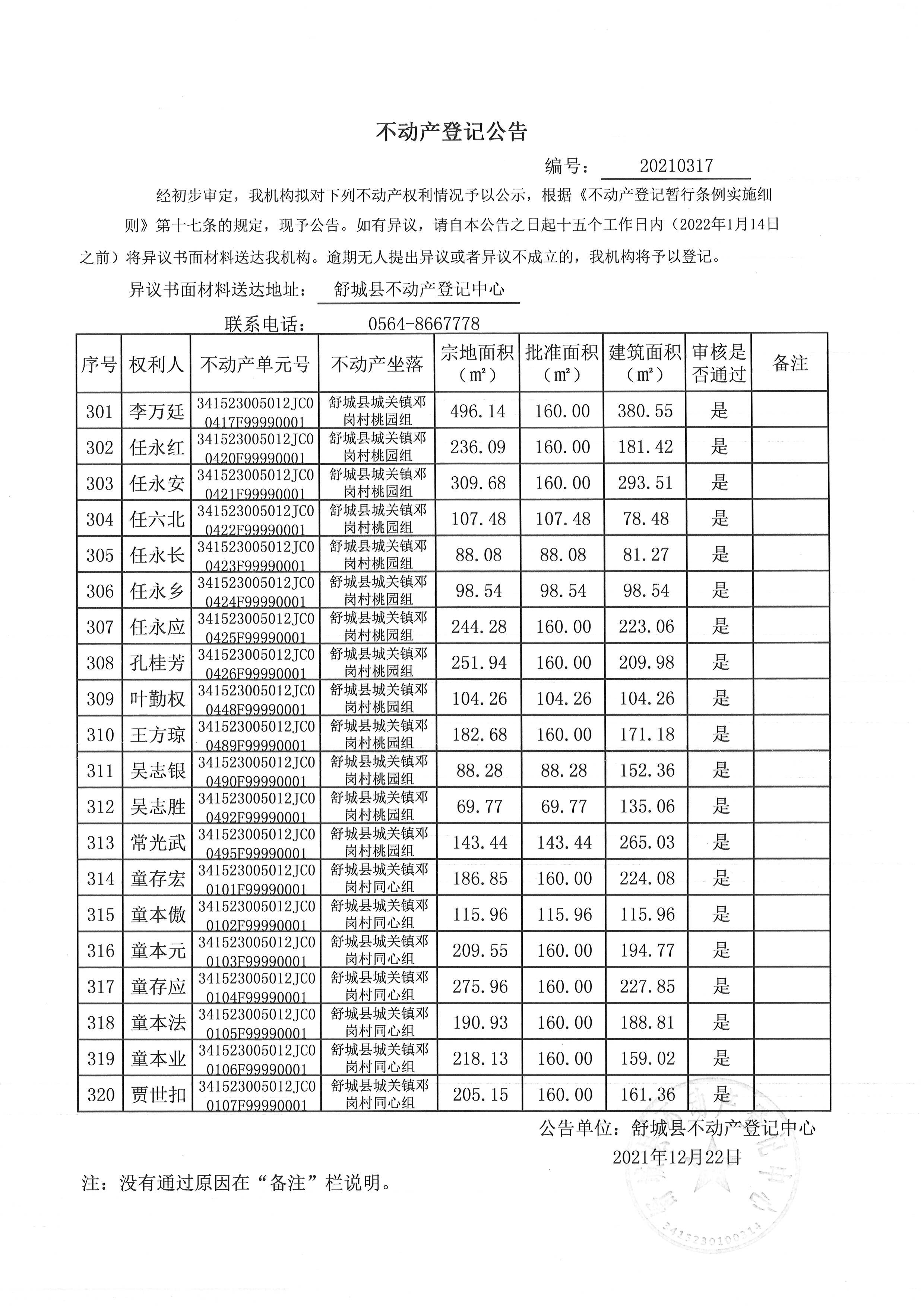 关于舒城县城关镇邓岗村大庄组等16个村民组农村不动产权利首次登记公告