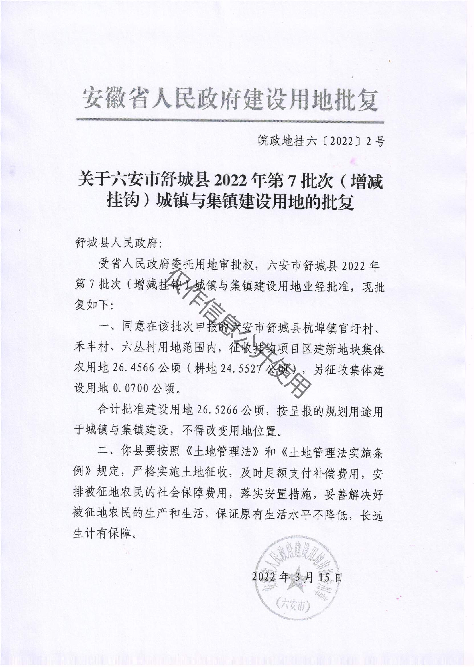 舒城县2022年第7批次(增减挂钩)城镇与集镇建设用地批复