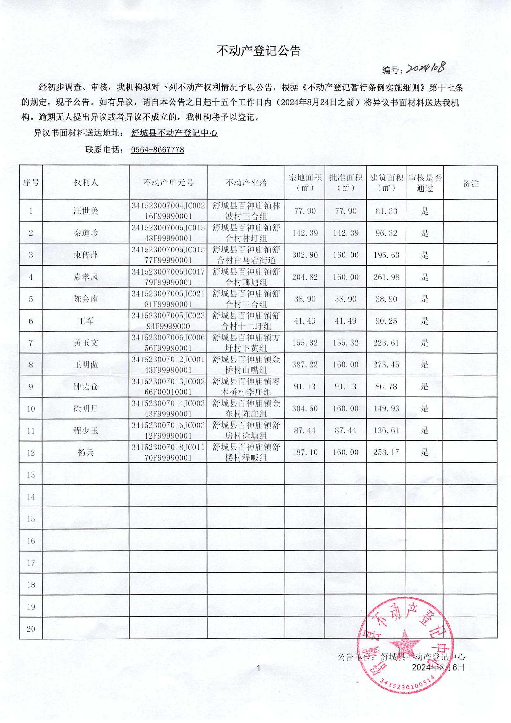 关于舒城县百神庙镇林波村等8个村及汪世美等12户农村不动产权利首次登记公告