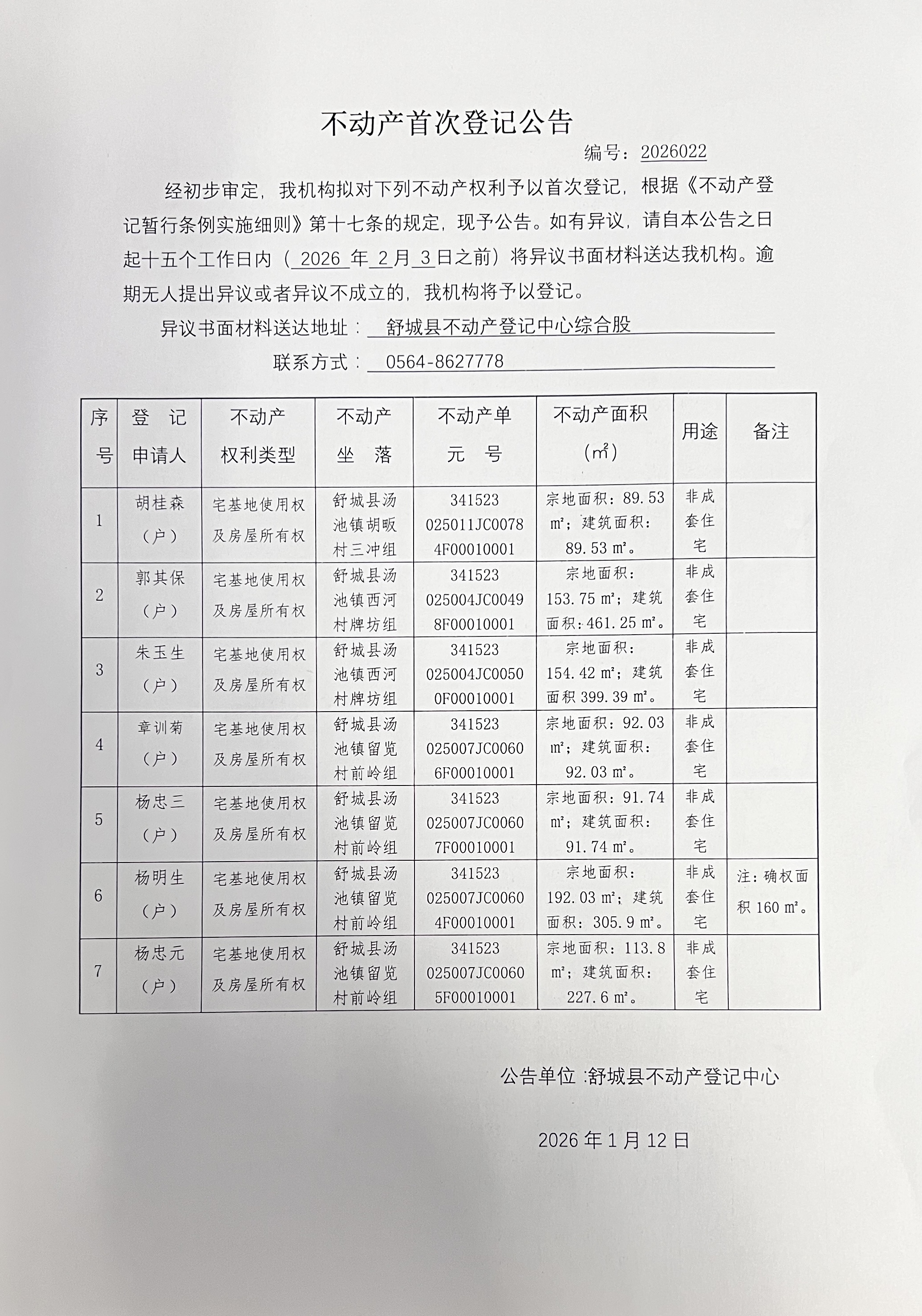 关于胡桂森等户不动产首次登记的公告