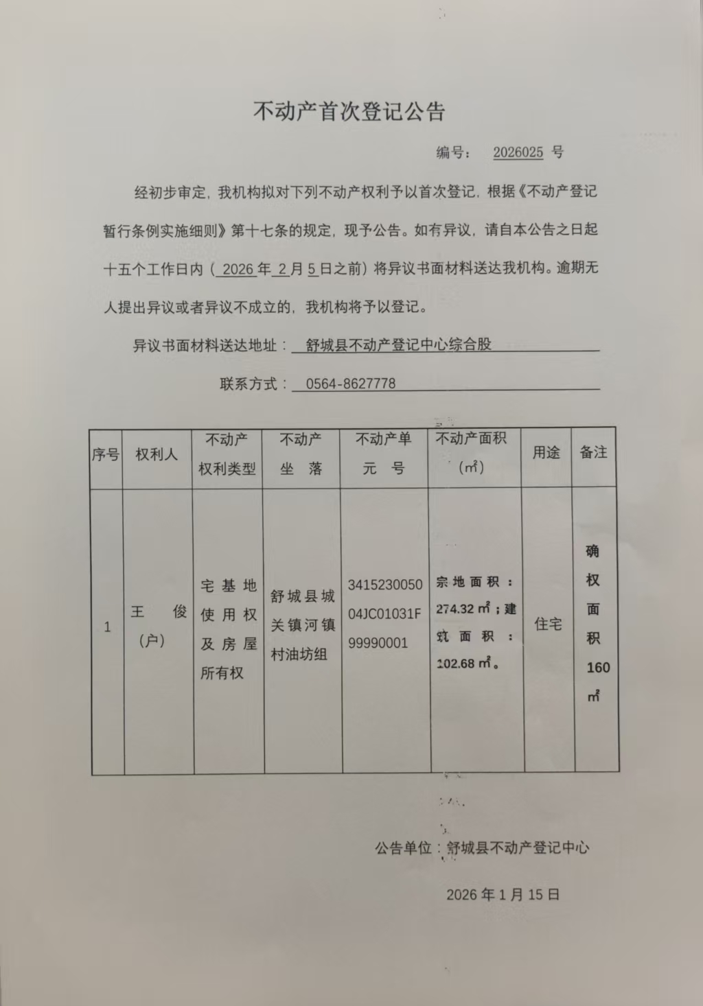 关于王俊(户)不动产权首次登记公告