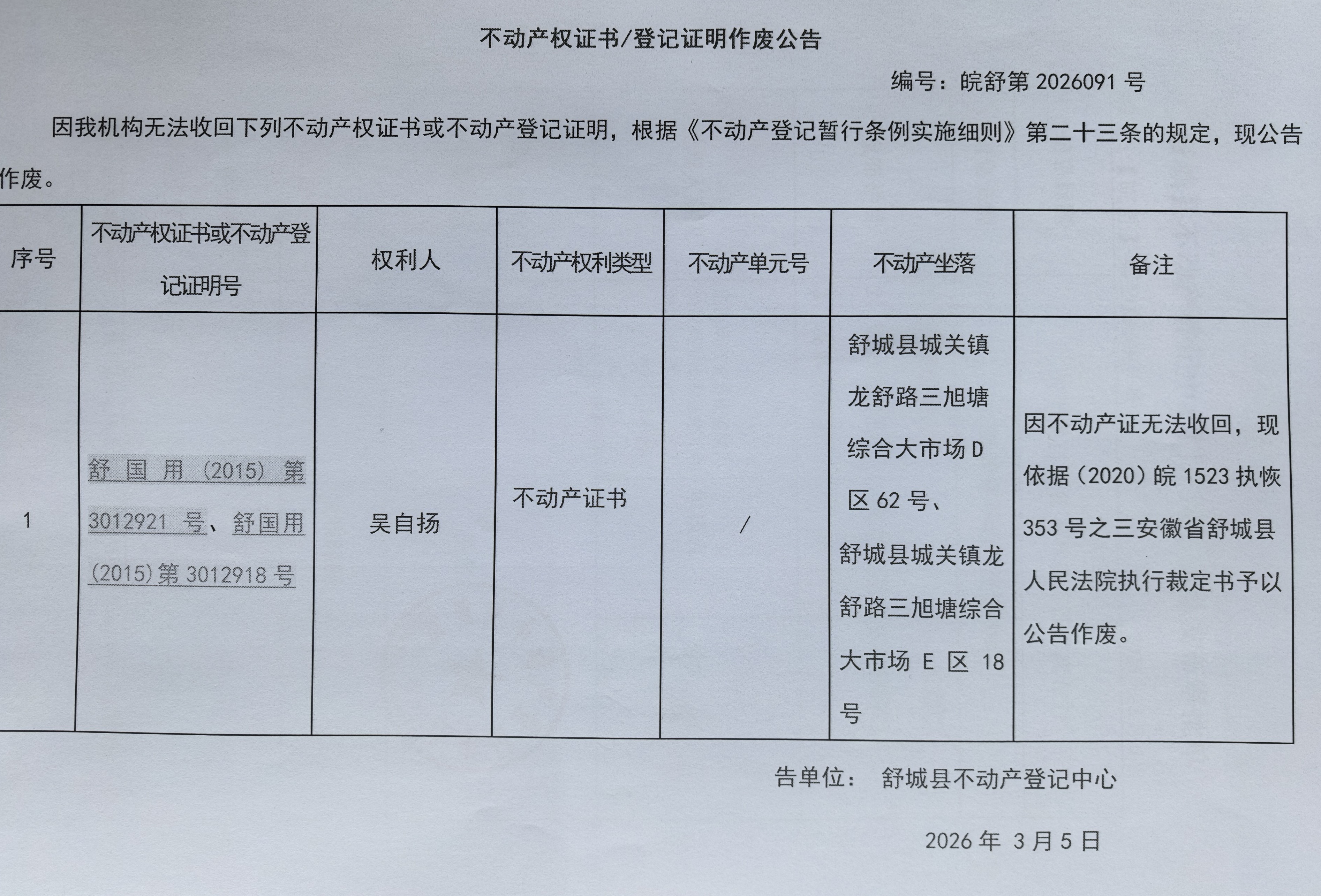 关于吴自扬不动产权证书作废公告