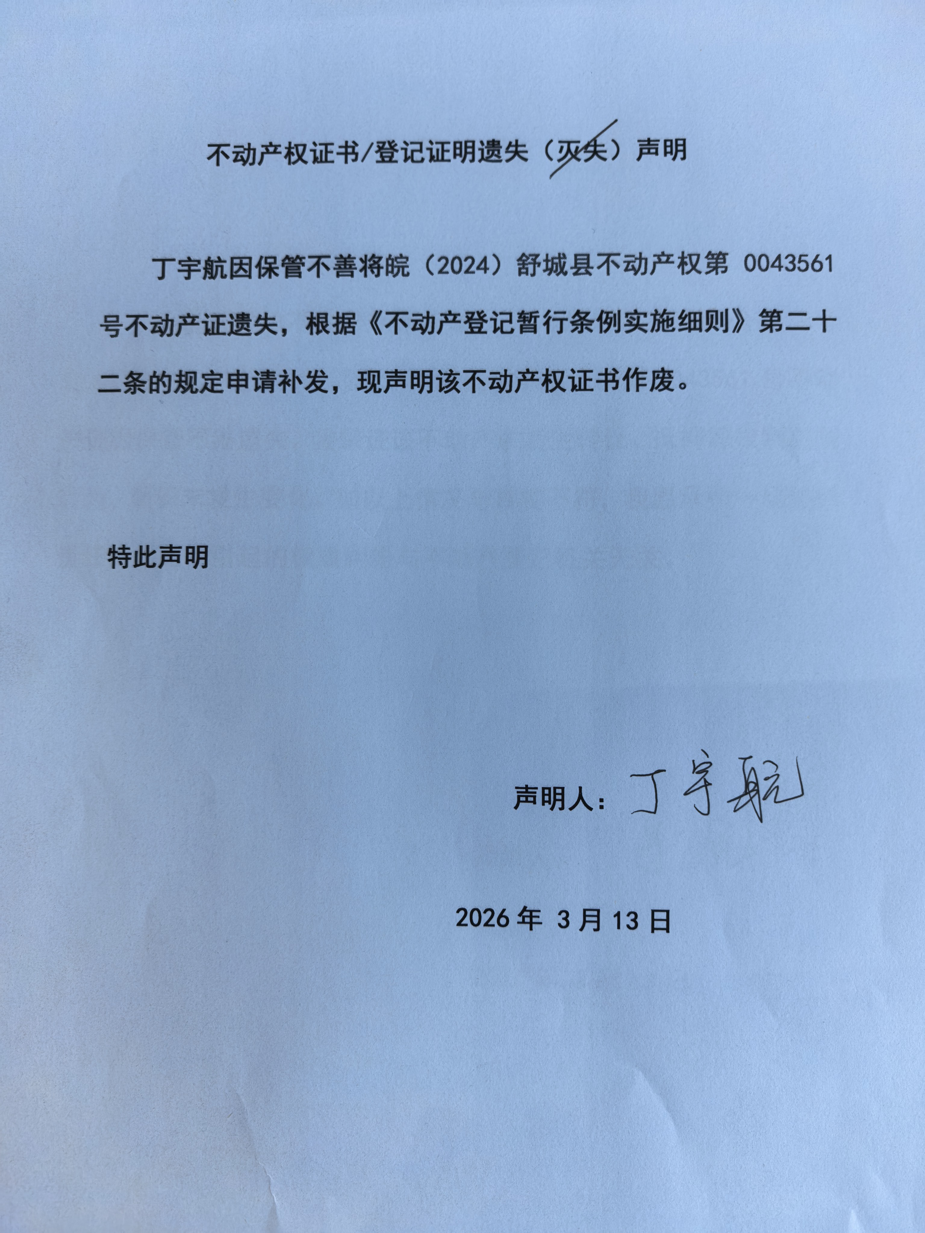 关于丁宇航不动产权证书遗失声明公告