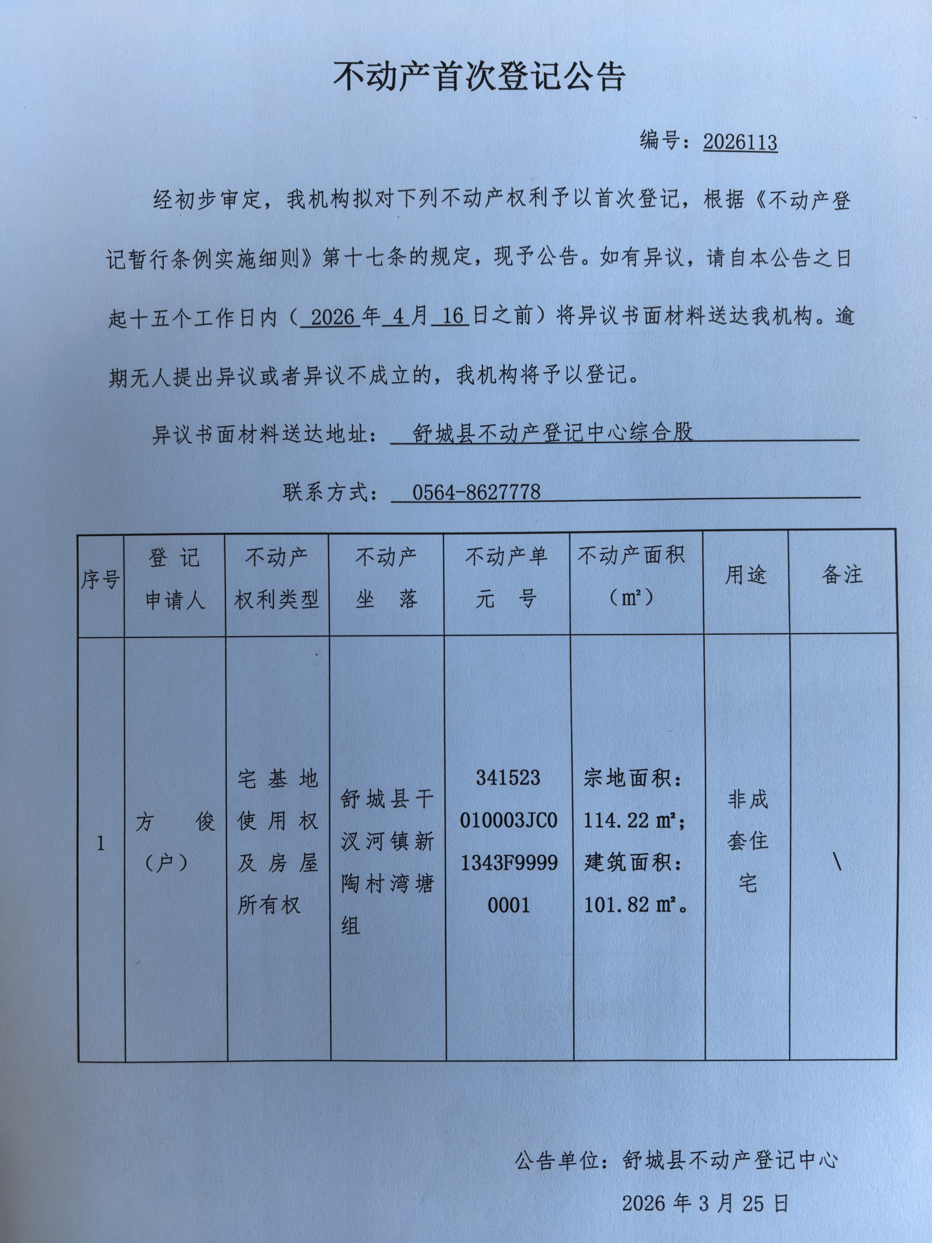 关于方俊户不动产首次登记公告