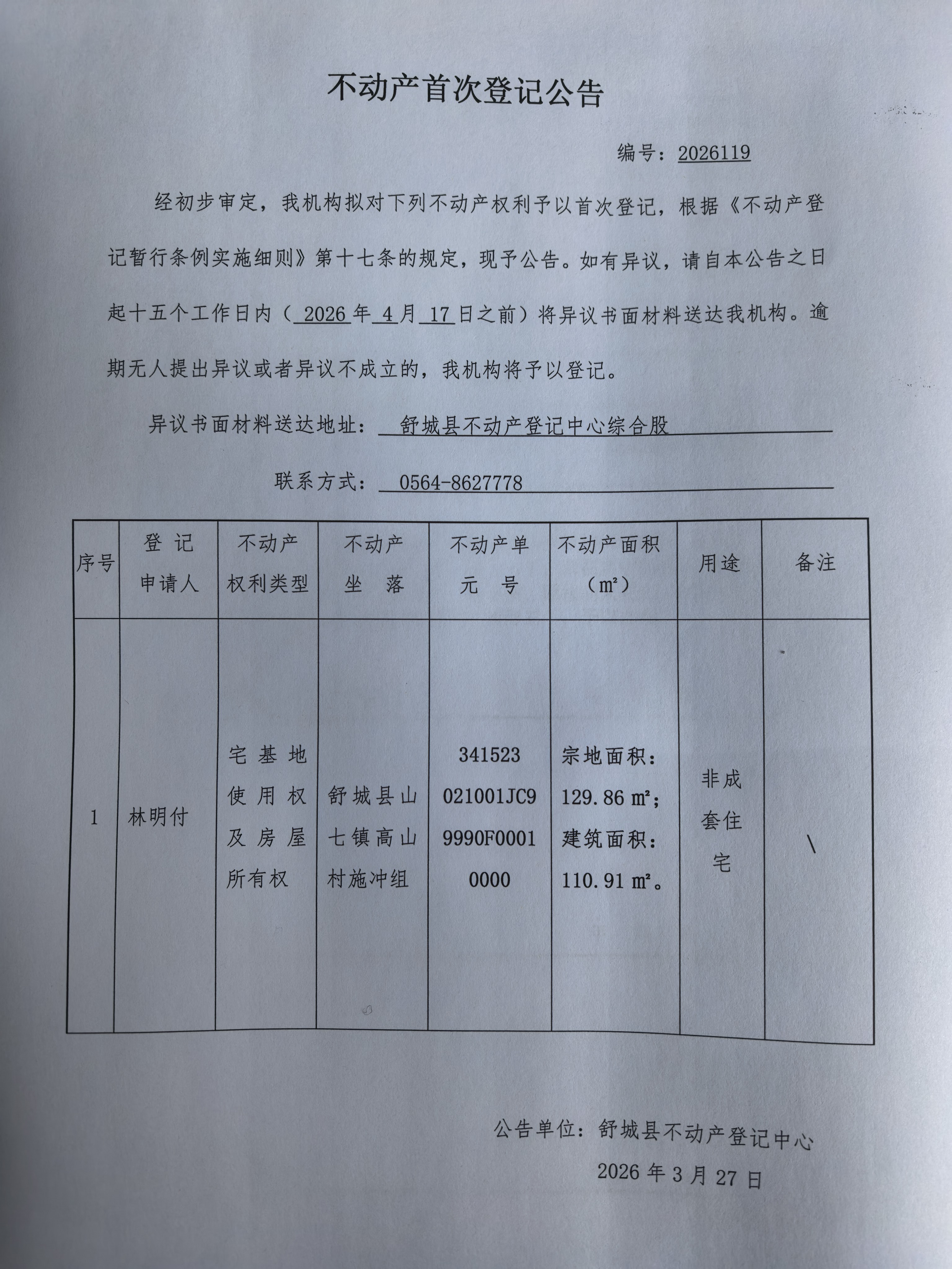 关于林明付不动产首次登记公告
