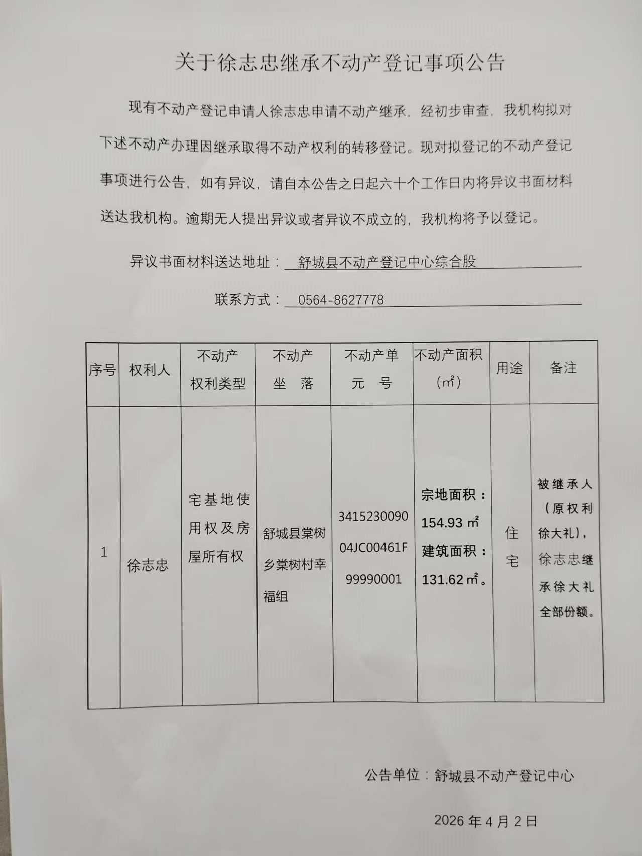 关于徐志忠继承不动产登记事项公告