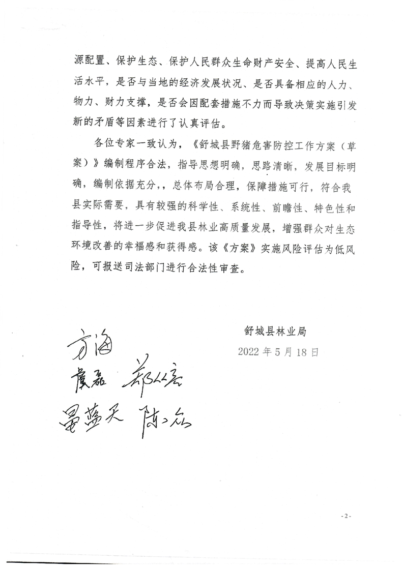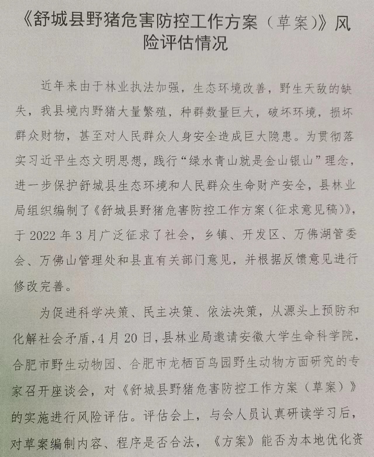 【风险评估】《舒城县野猪危害防控工作方案》风险评估情况