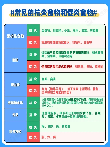 首先,从饮食入手。多吃“抗炎”食物,少吃“促炎”食物。根据《抗炎饮食预防肿瘤的专家共识》的建议,我们可以选择以下六大类抗炎食物和避免促炎食物。