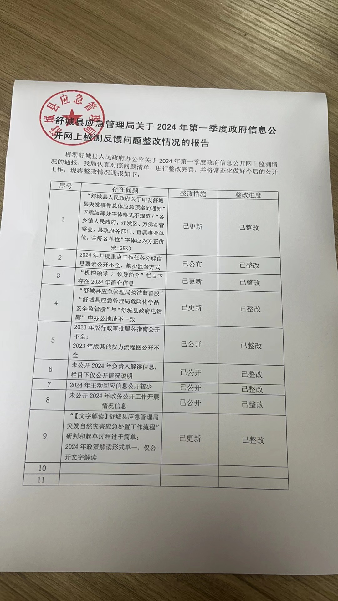 舒城县应急管理局关于2024年第一季度政府信息公开网上检测反馈问题整改情况的报告