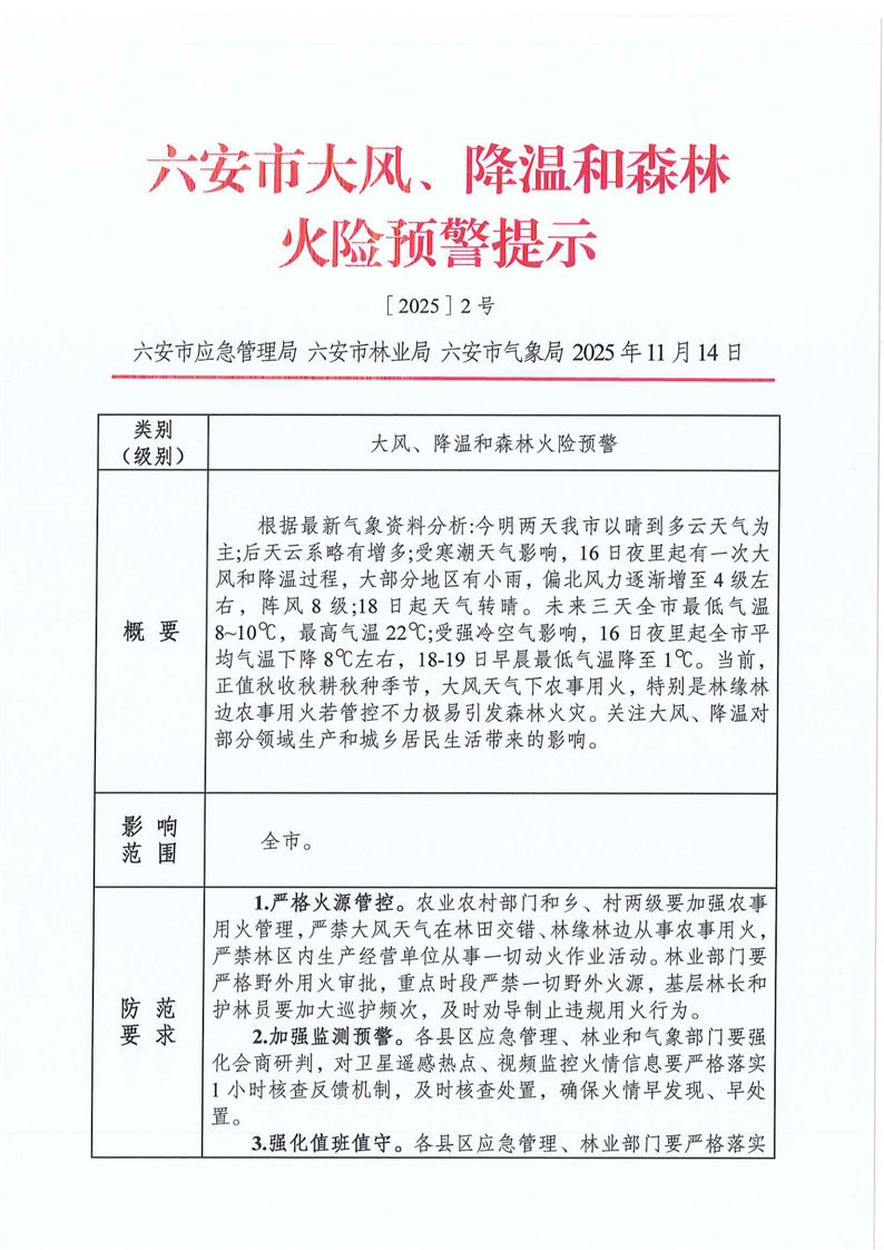【大风、降温和森林火险预警】六安市大风、降温和森林火险预警提示