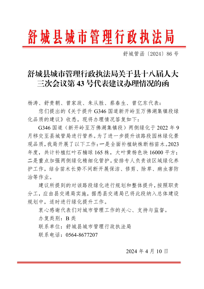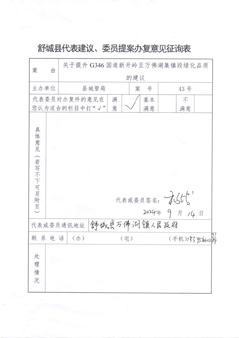 舒城县城市管理行政执法局关于县十八届人大三次会议第43号代表建议办理情况的函、意见征询表