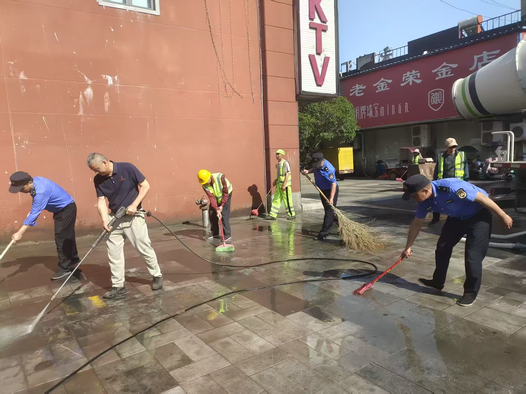 行动中,各部门各司其职、协同合作。县城管综合执法大队机动中队承担起现场的统筹组织工作,县环卫所则为大扫除提供了专业的技术支持,县小吃协会工作人员也积极配合参与其中。首先,洒水车率先对安置点区域展开全面冲洗,将地面的浮尘和杂物一并冲走,为后续清洁工作奠定了良好基础。紧接着,利用“工业碱”抛洒在地面上,借助其碱性特性有效分解油污,为彻底清除地面顽固污渍创造有利条件。随后,执法队员、环卫工人、小吃协会工作人员纷纷动手,拿起扫把、拖把、毛刷、钢丝球等各类作业工具,针对安置点区域的地面、砖缝墙角以及犄角旮旯等不易清理的部位进行细致冲刷。他们秉持着不放过任何一个卫生死角的态度,全力清除各种油污油渍、浮土污泥。最后,再次出动洒水车将地面彻底冲洗一遍,确保地面干净整洁,达到理想的清洁效果。
