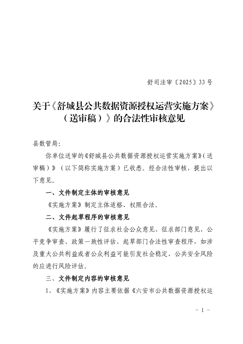 【合法性审核】关于《舒城县公共数据资源授权运营实施方案》(送审稿)》的合法性审核意见
