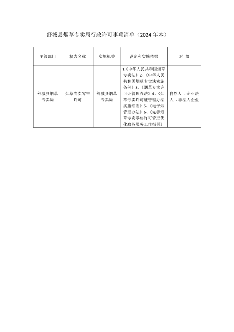 舒城县烟草专卖局行政许可事项清单(2024年本)
