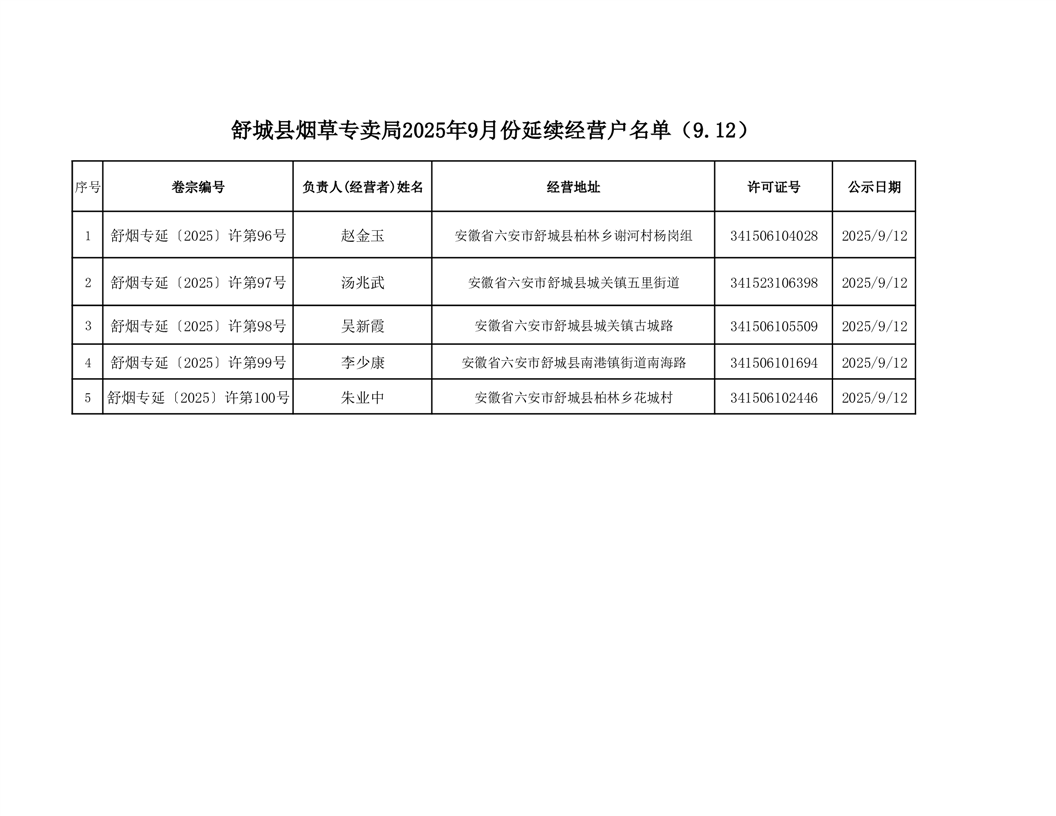 舒城县烟草专卖局延续户名单(2025.9.12)