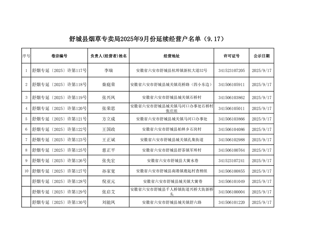 舒城县烟草专卖局延续户名单(2025.9.17)
