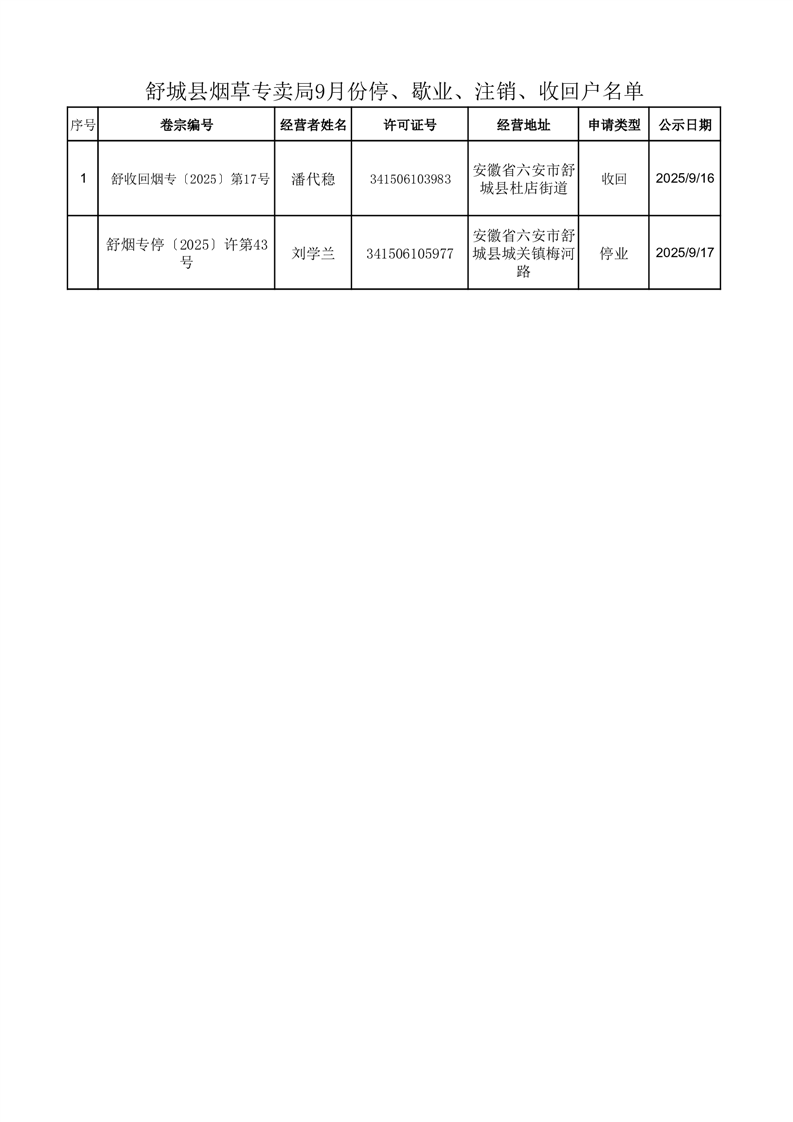 舒城县烟草专卖局停、歇业、注销、收回户名单(9.17)