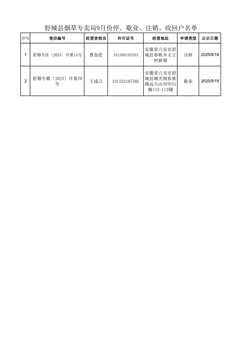 舒城县烟草专卖局停、歇业、注销、收回户名单(9.19)