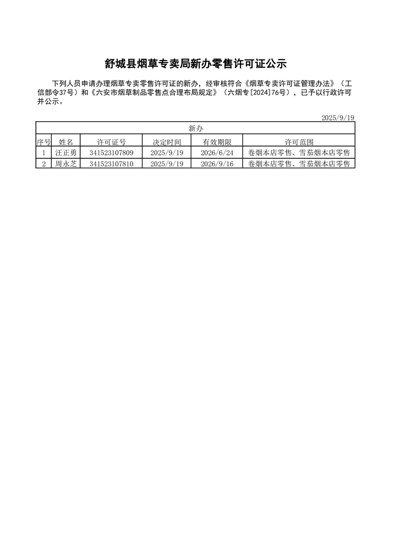 舒城县烟草专卖局新办零售许可证公示 (2025.9.19)
