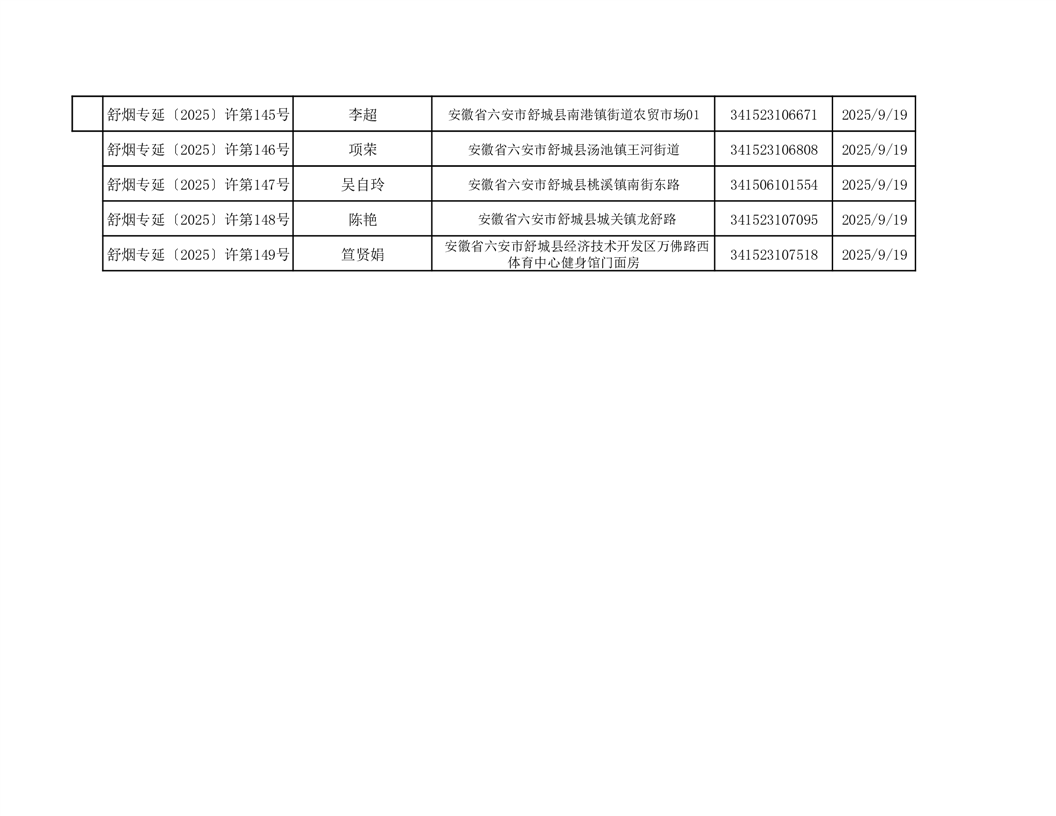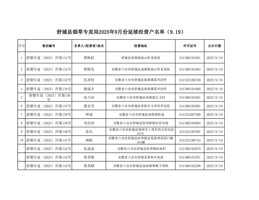 舒城县烟草专卖局延续户名单(2025.9.19)
