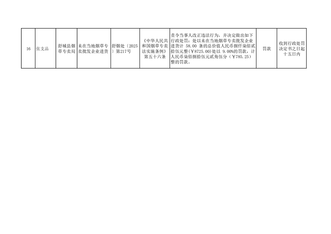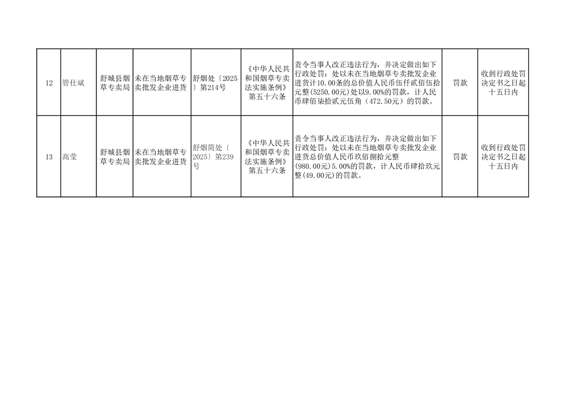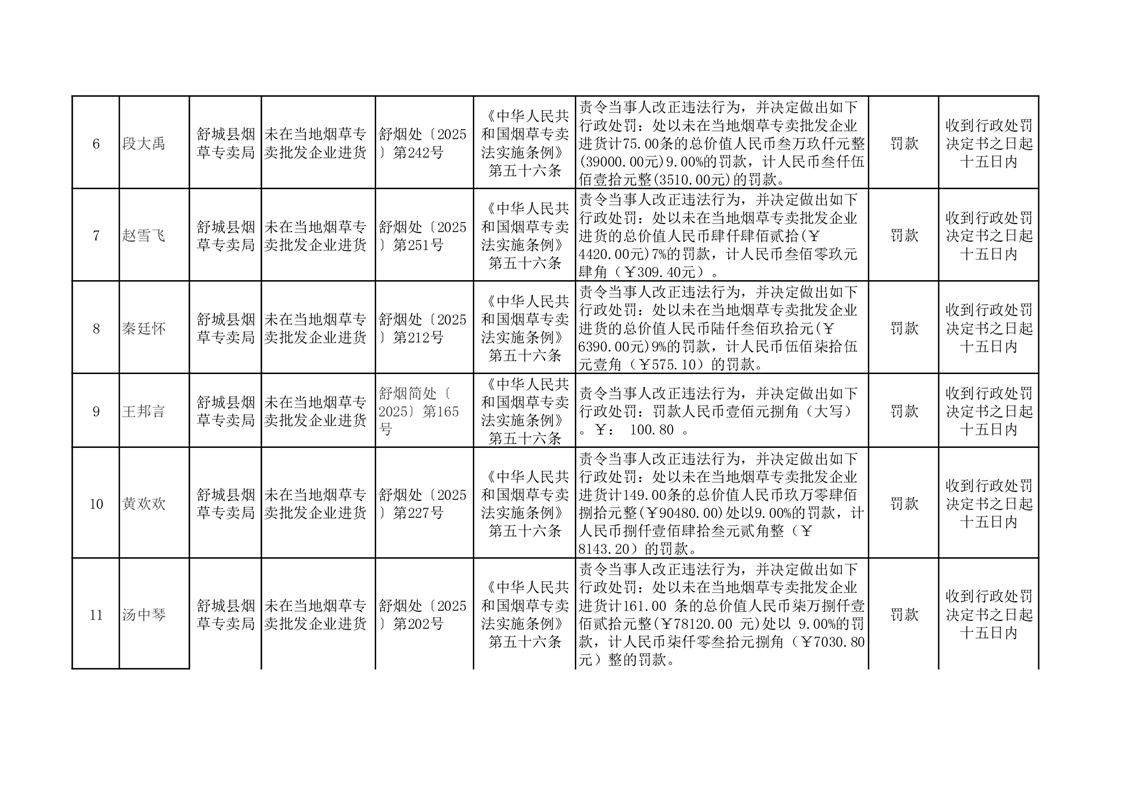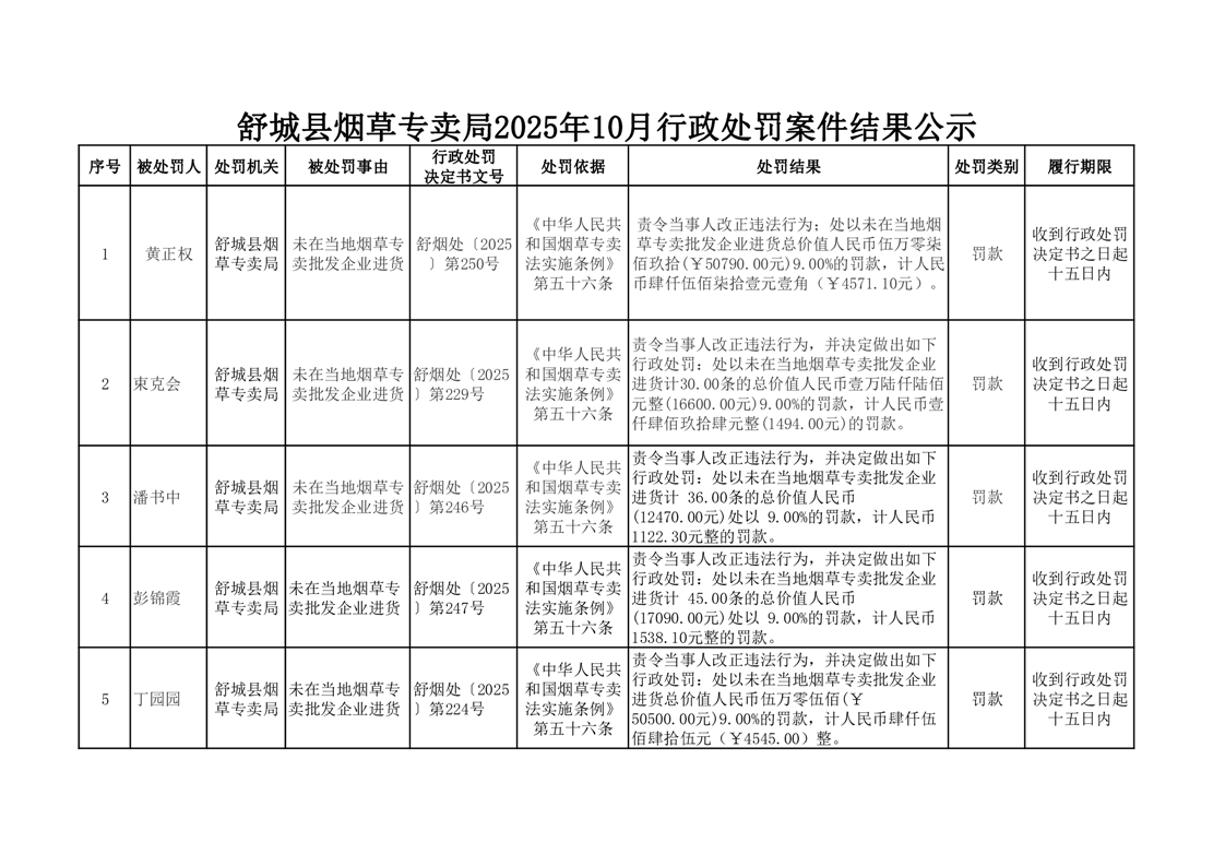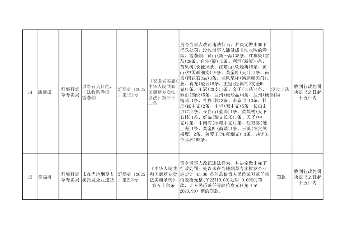 舒城县烟草专卖局2025年10月行政处罚案件结果公示