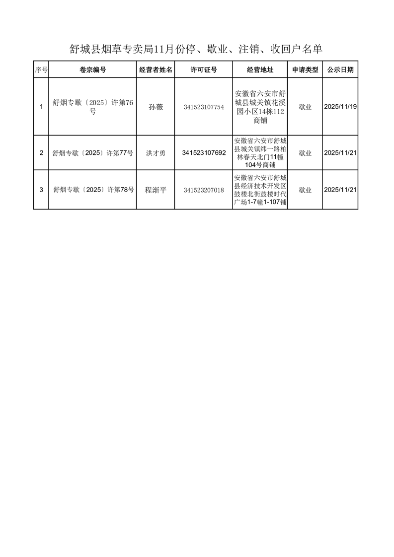 舒城县烟草专卖局停、歇业、注销、收回户名单(11.21)