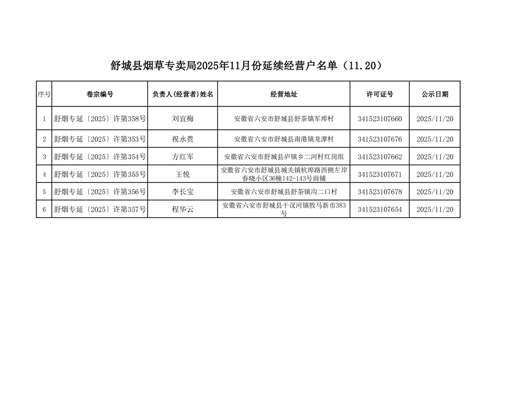 舒城县烟草专卖局延续户名单(2025.11.20)
